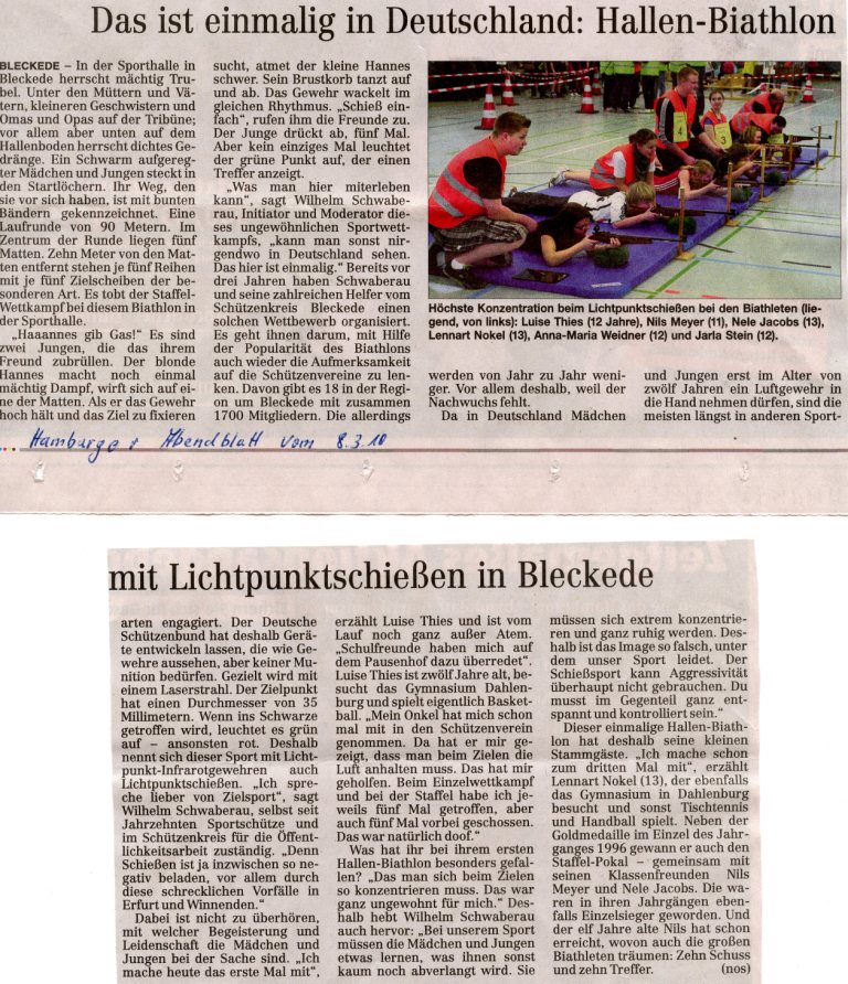 Unter der Schirmherrschaft des Schützenkreises Bleckede veranstaltet die Schützengilde Bleckede am Sonntag, den 28.02.2010 ab 13 Uhr in der neuen Dreifeldhalle an der Lüneburger Straße einen Hallen-Biathlon mit Lichtpunktgewehren für Kinder und Jugendliche der Jahrgänge 1994 bis 2004.