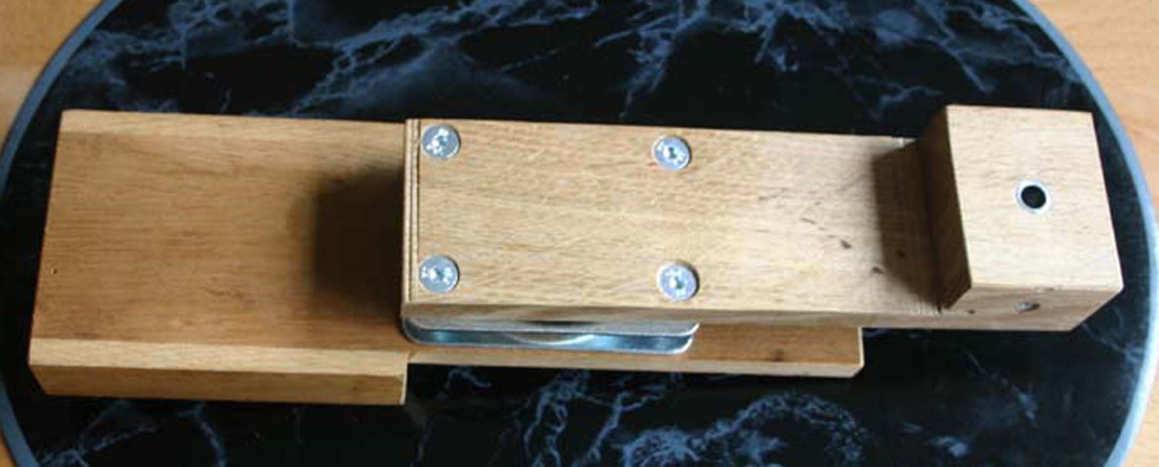 Die Grundplatte liegt unter den Seilen der Seilzuganlage. Wenn der Scheibenhalter inkl. Scheibe nach vorne gefahren ist, ist die Lupi in der Position wie im letzten Bild zu sehen. Wenn die Scheibe nun zum Schützen hergefahren werden soll, wird die Lupi (mit der Schießhand) nach hinten gezogen. Durch die Konstruktion schwenkt so die Lupi aus dem Bereich der Seilzuganlage weg und die Mündung der Lupi zeigt immer (!) nach vorne Richtung Geschoßfang (Sicherheitsaspekt!)