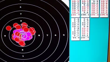 In der 2.+3. Serie wären drei „neuner“ auch mit 9mm Umschlossenem Schussbild nicht an die 10 zu holen. Das waren reine Schützenfehler, und da fliegen die Geschosse fast immer weit in den 9er Ring. Aber mit 16 mm umschlossen währen es wohl zwei 9er mehr.