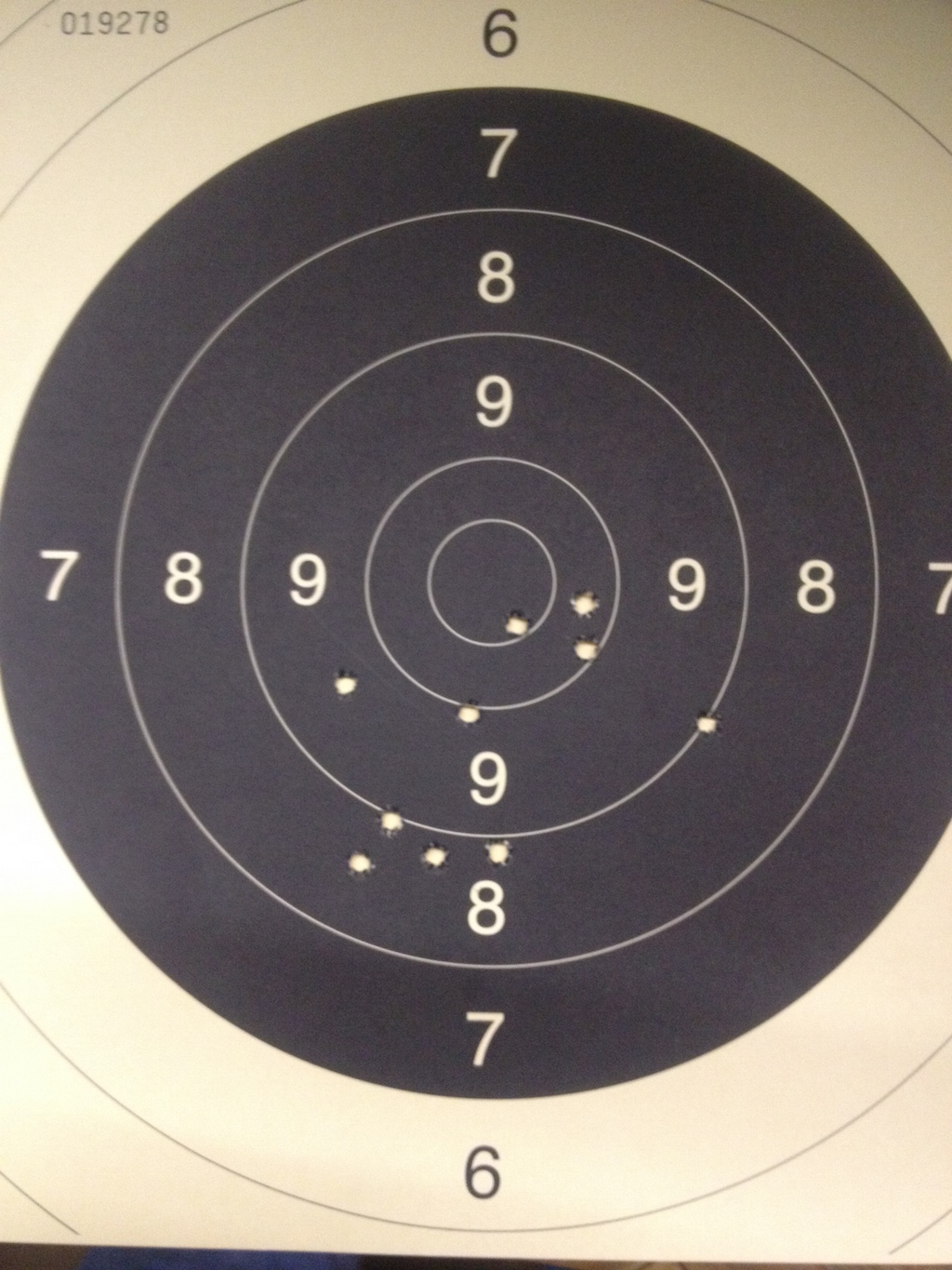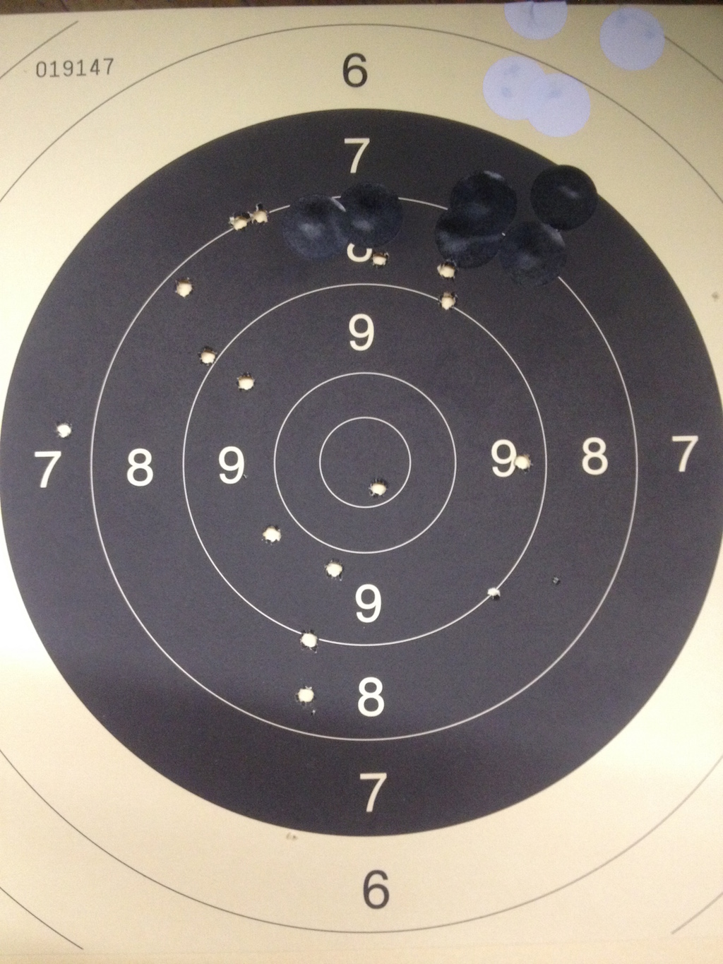 Erstes Bild RWS Pistol Match, Waffe eingestellt auf diese Munition von der Visierung, waren die ersten 10 Schüsse hoch, war ein neues Päckchen, war beim letzten Wettkampf, einen Tag zuvor, nicht so, dann fünf Rasten runter gedreht und noch einmal fünf Schuss drauf gemacht.