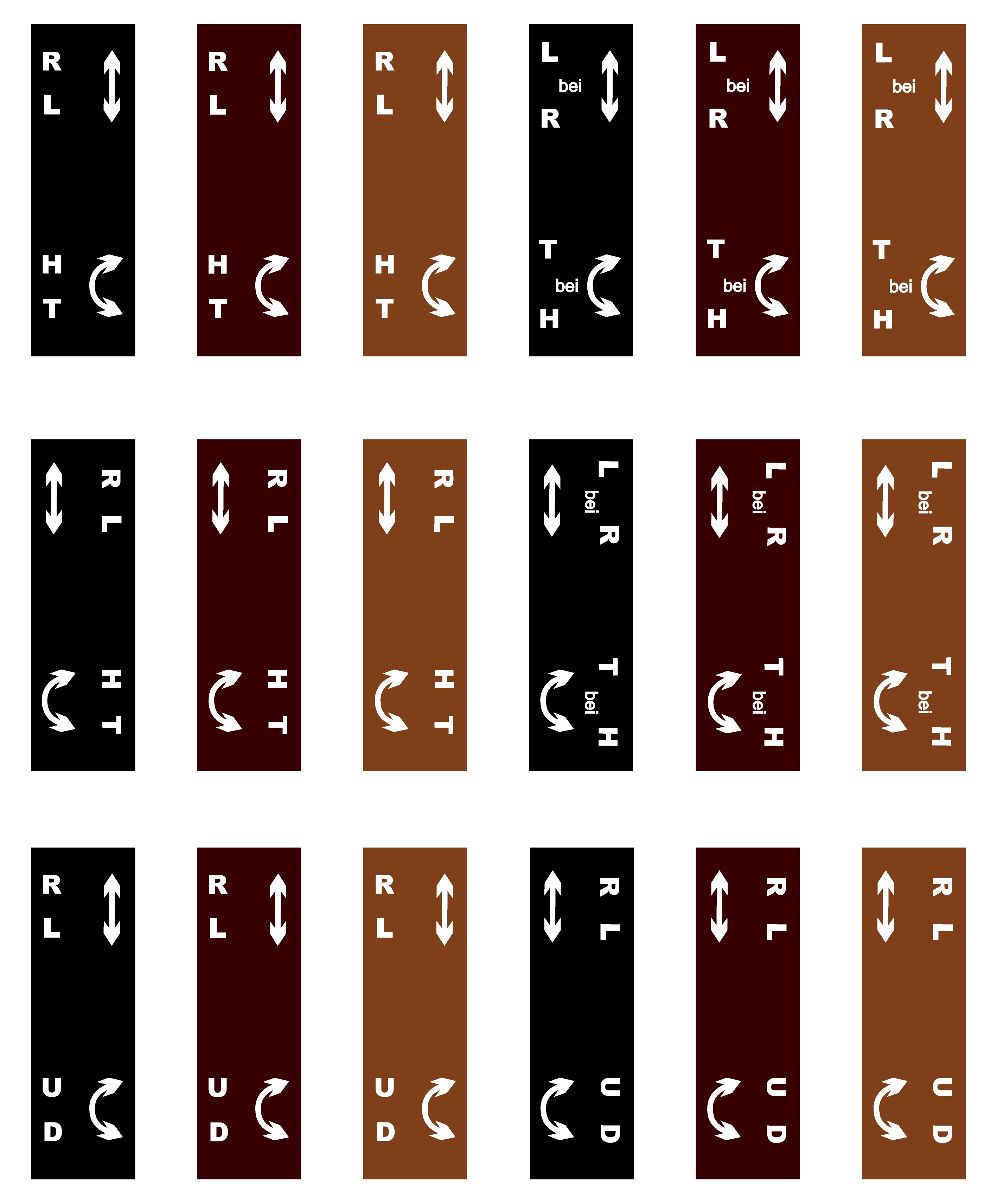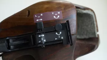Den Aufkleber kann man auf oder neben die Kimme kleben und je nach Vorlieben ändert sich der Winkel in dem man auf die ruhende Waffe schaut. Das ergibt unterschiedliche Ausrichtungen der Beschriftung. Und es gibt ja Leute, die lieber bei rechts drehen als nach rechts. Die englischsprachige Welt gibt’s auch noch und die Farbe des Holzes der Griffe kann ganz unterschiedlich ausfallen.