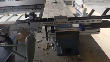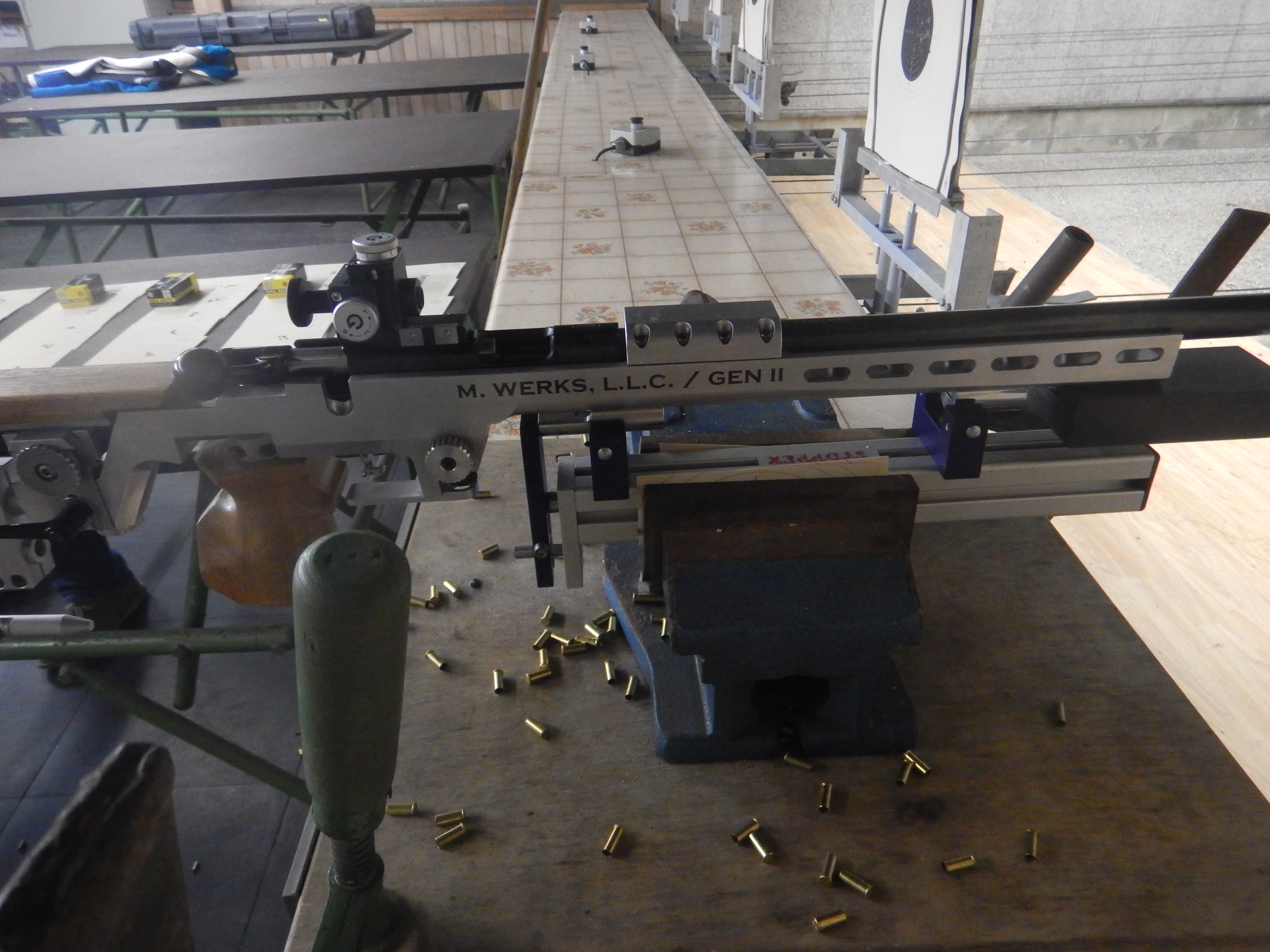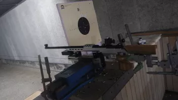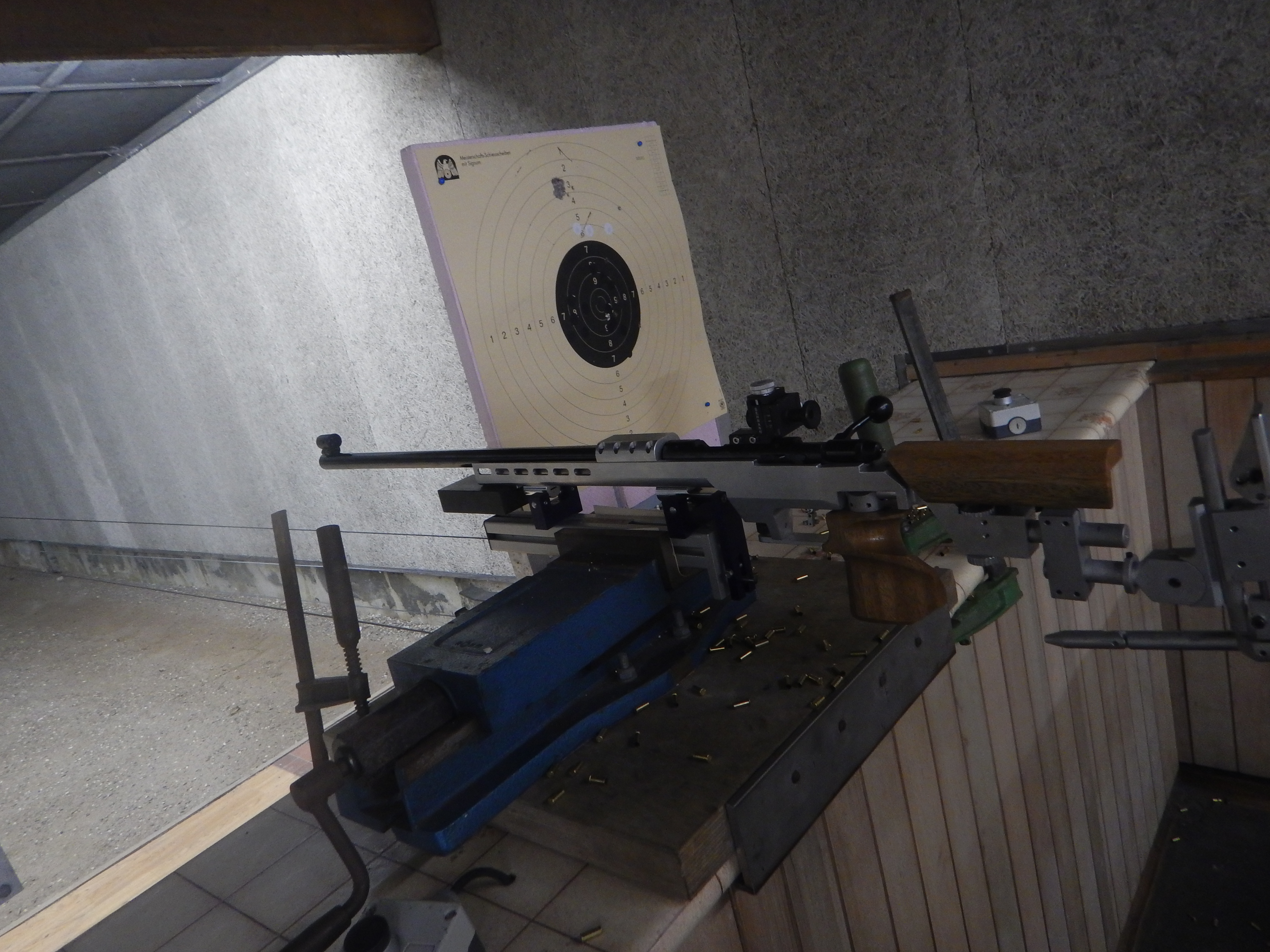 Testaufbau: Gewehr auf Stopper Einschießmaschine, 50m.