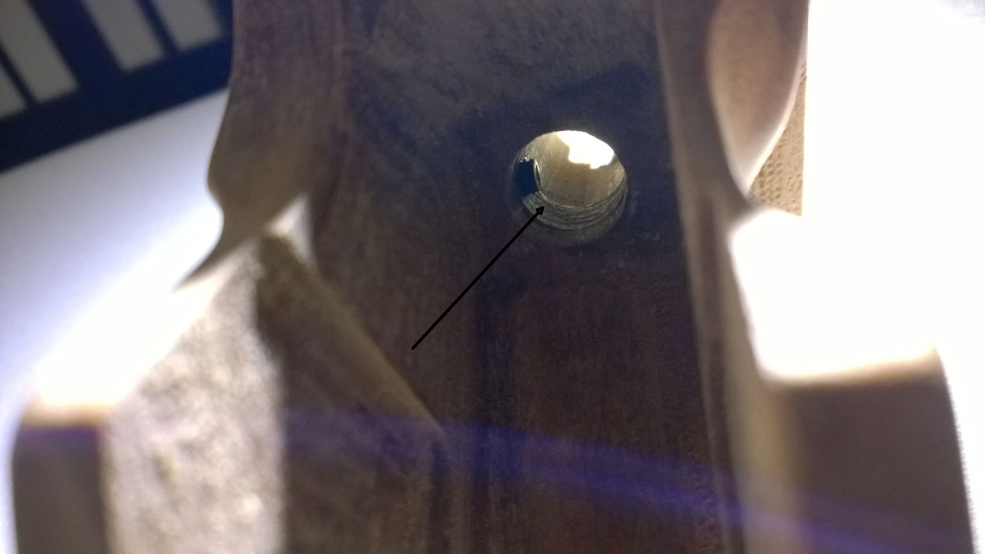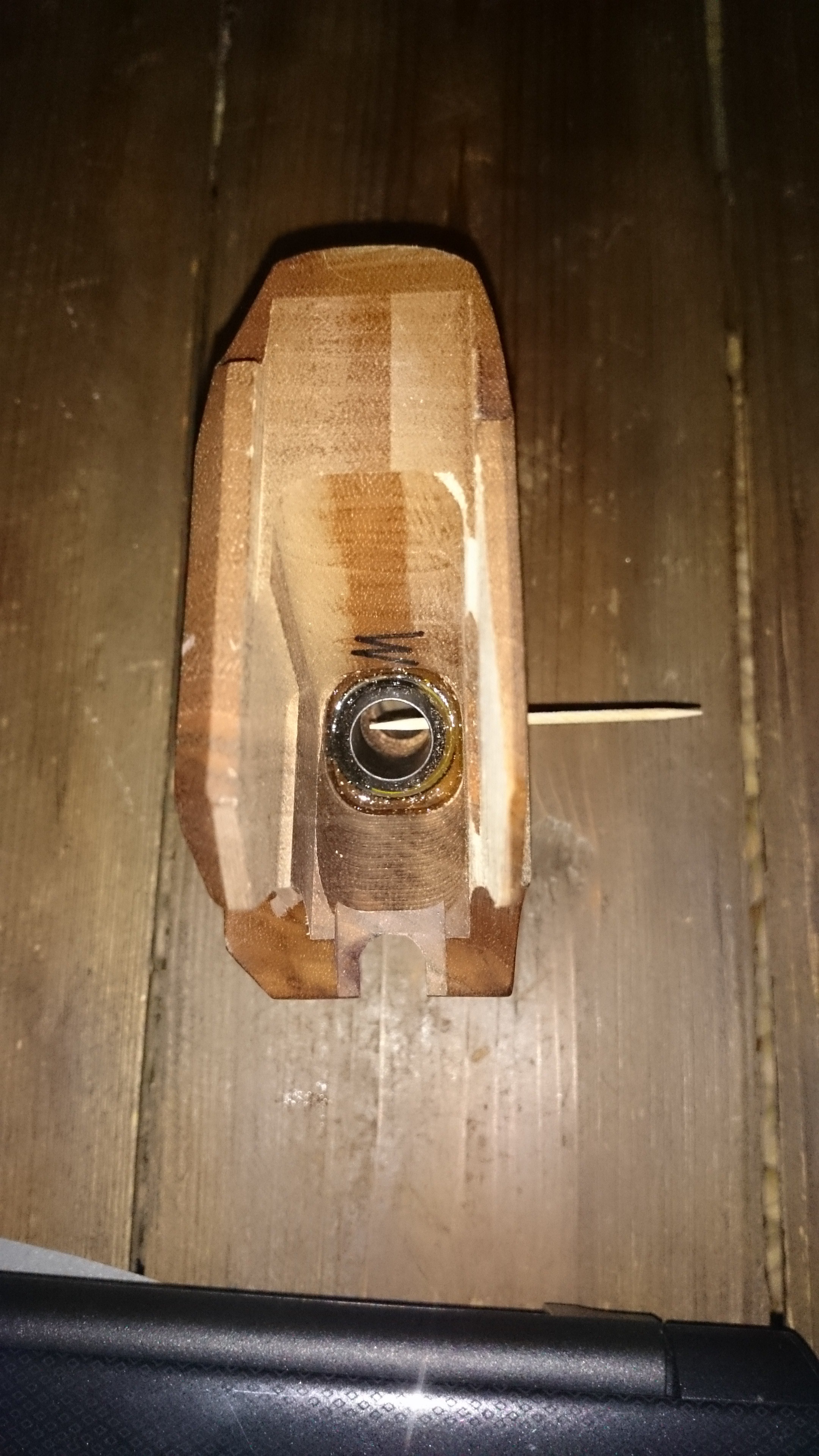Nun komme ich aber an meine alte Grenze: Die LP400 hat diesen 3D-Memory-Griff. In dem Griff ist eine Hülse mit seitlicher Gewindebohrung (siehe Foto mit seitlich eingesteckten Zahnstocher) eingeklebt. In der Walther Ersatzteilliste taucht dieses Teil aber nicht auf! Sondern nur der Griff als Baugruppe. Theoretisch könnte man sich diese Hülse selber fertigen, aber dafür bräuchte ich die genauen Maße => das könnte nicht ganz einfach werden.