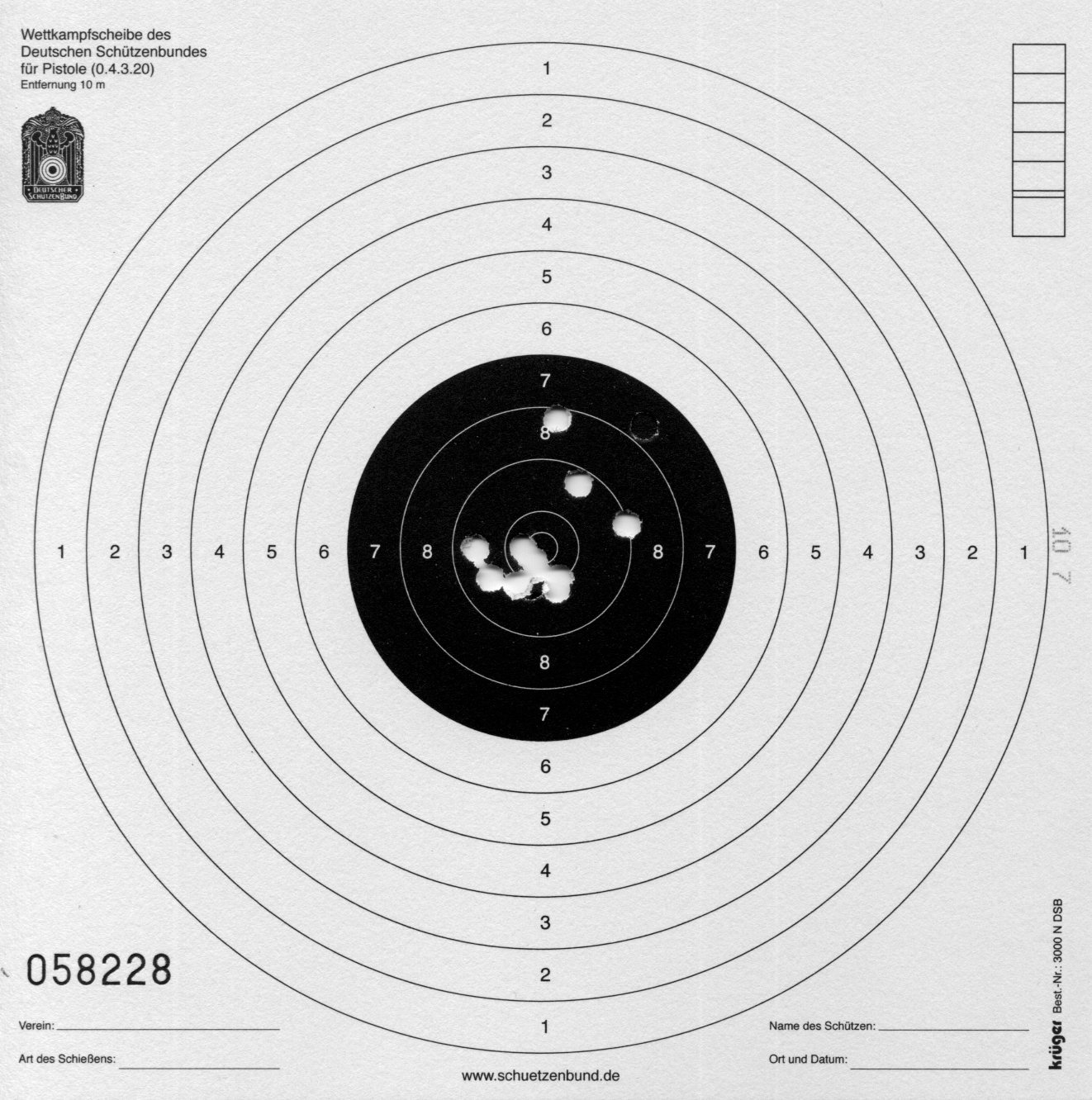 Die Schußbildausreißer lagen zwischen 8,4 hoch und 8,4 tief, von der breite her lagen sie zwischen 8,6 links und 8,6 rechts.