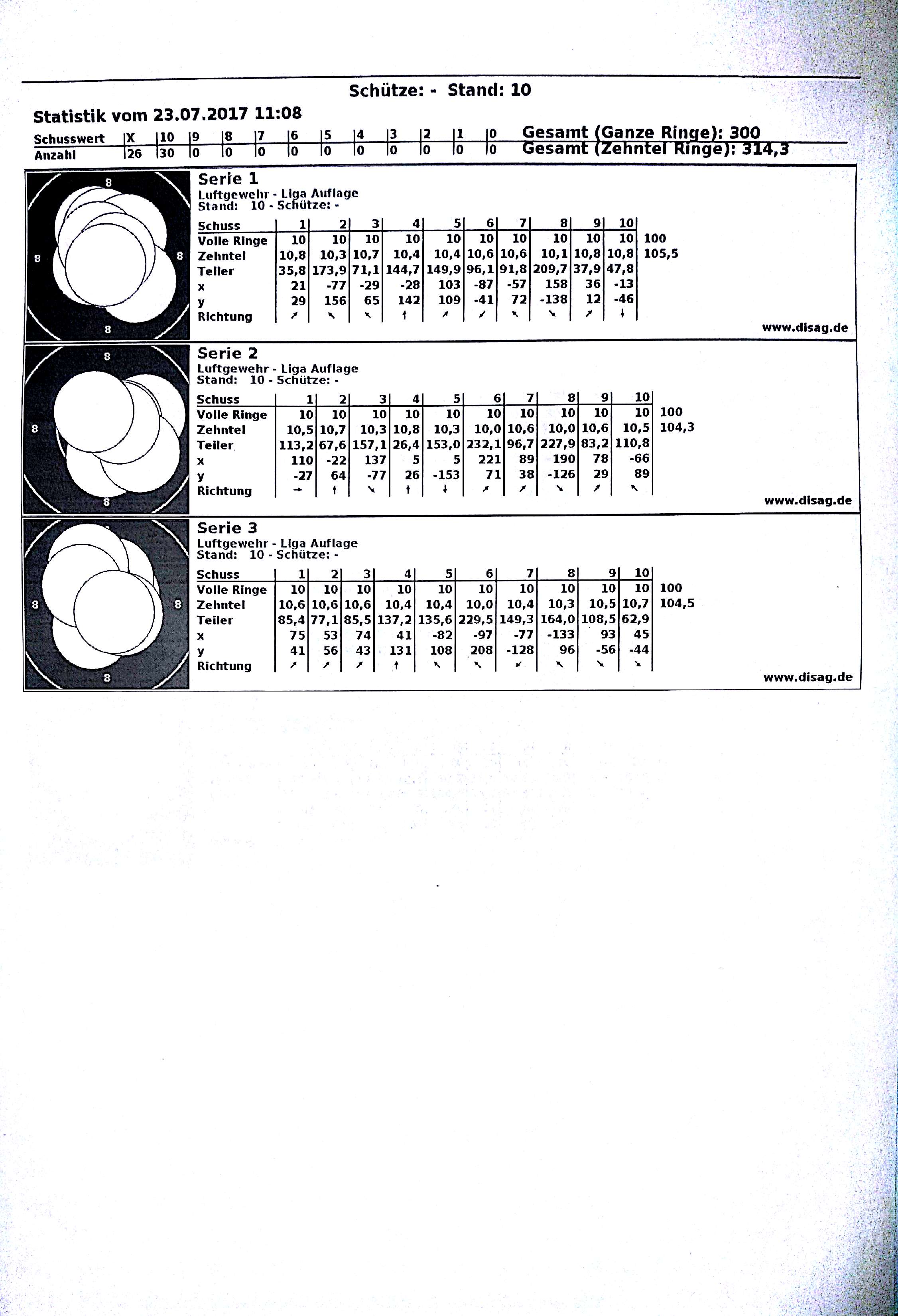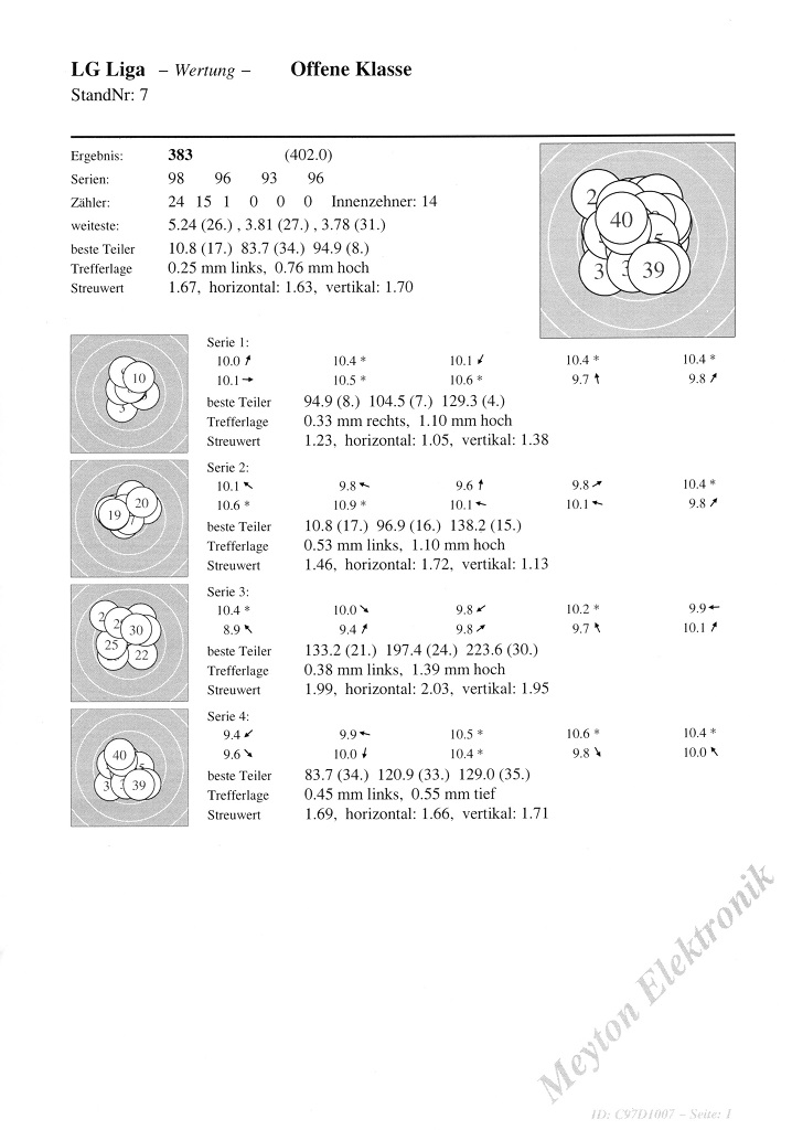 vielleicht könntest Du Deine Auflageergebnisse unter dem Vorbehalt angeben, dass sie nach ÖSB-Regel geschossen wurden - bis auf die höhere Schusszahl und analgog längere Schießzeit nehme ich an wird es beim ÖSB keine Vorteile gegenüber dem DSB geben, aber diese Beurteilung und ob man von Deinen 40 Schuss aufgelegt Ergebnissen einfach nur die ersten 30 wertet, müsste man anderen überlassen. Dafür fehlt mir zum Auflageschießen jegliches Wissen und ich bin beim Stammschießen ja auch nur Teilnehmer.