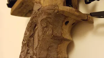 Einige Bilder sind aus diesem Thread entnommen, d.h. das sind Fotos diversen "Griffbearbeitern", die ich mal analysemäßig unter die Lupe genommen habe. Die ersten beiden Seiten zeigen, wie dort beschrieben, eine Arbeit von Ralf Schumann, auf den Seiten 3 u. 4 findet einen von mir bearbeiteten Nill-Griff (blau-graues Schichtholz), wo ich die Mulden nur ausgeschliffen habe. Da habe ich im Fingerbereich nichts aufgetragen. Auf der Seite 5 habe ich einen Griff von Gunslinger abgebildet, der auch nur nachgeschliffen und nichts aufgetragen hat. Diese Bearbeitung hat er über einen längeren Zeitraum vorgenommen. Wenn man nur was abträgt und nichts wieder auftragen will, dann muss die Bearbeitung ja besonders akribisch erfolgen. Auf Seite 6 sieht man links einen Griff von Matze, wo er seine Fingermittelglieder mittig unter den Lauf bekommen hat. Mitte und rechts wurde in dieser Hinsicht noch nicht so ganz das Optimum erreicht. Da könnte man die Mulden eventuell noch mal tiefer legen.