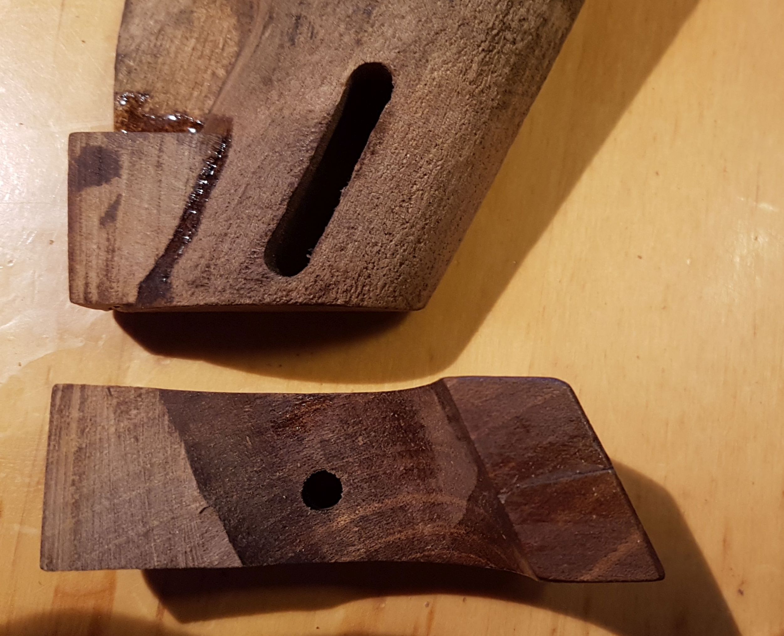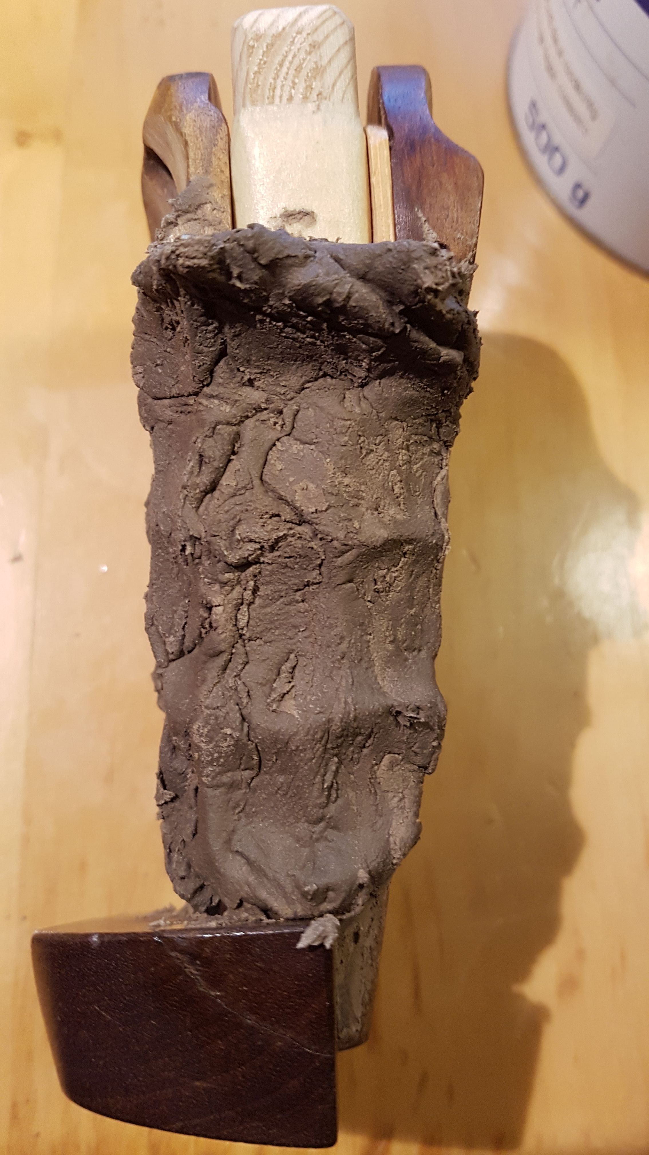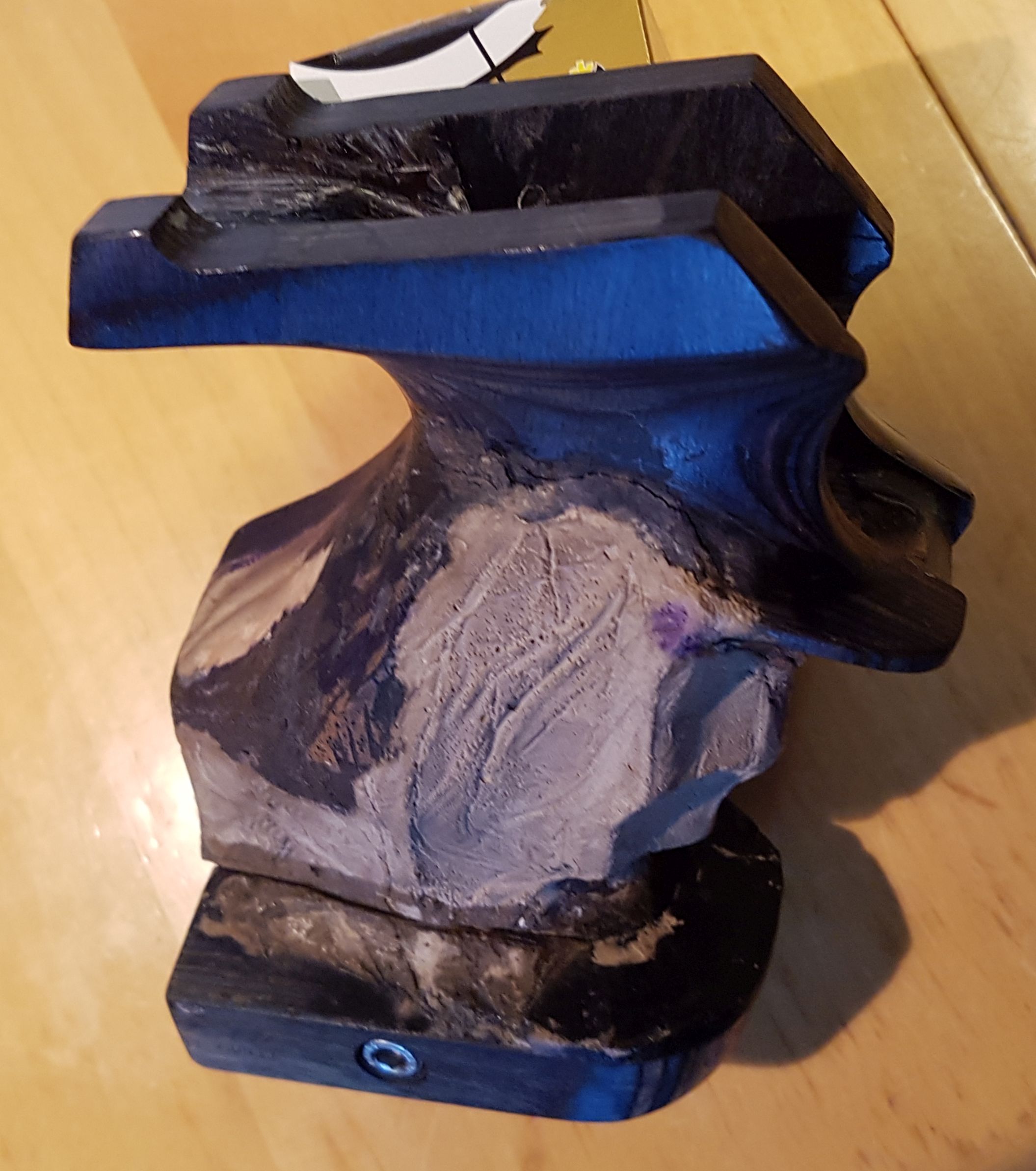 Für den blauschwarzen Schichtholzgriff habe ich dann versucht den naturholzfarbenen Holzkitt schwarz einzufärben, etwas, was nicht so wirklich von Erfolg gekrönt war. Ich werde noch mal einen anderen Holzkitt ausprobieren, aber das steht noch aus. Drum sieht der Griff so scheckig aus...![]()