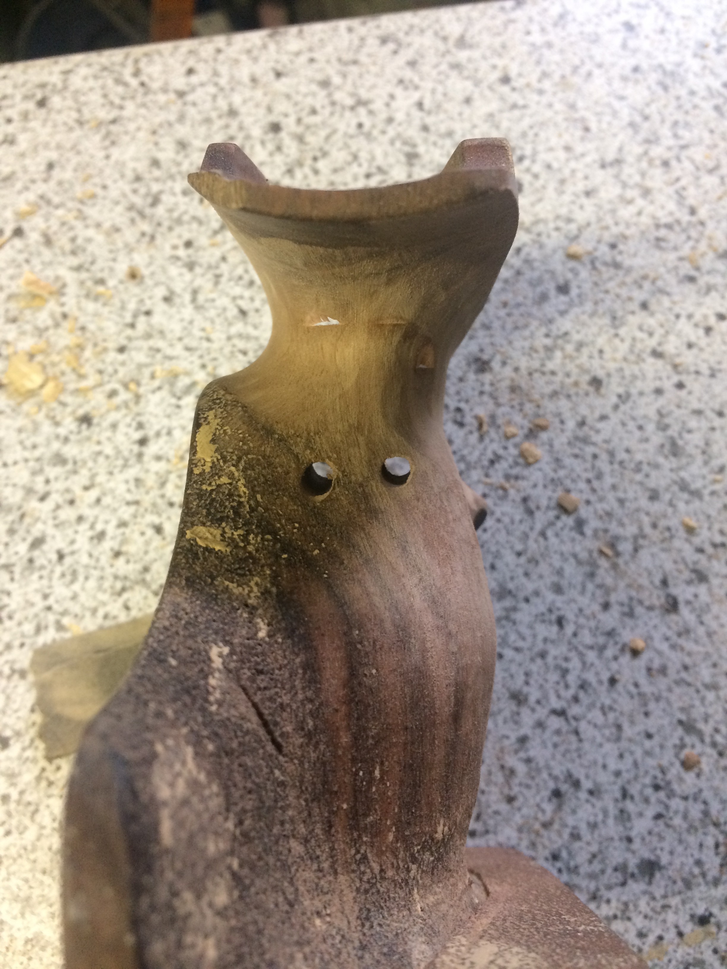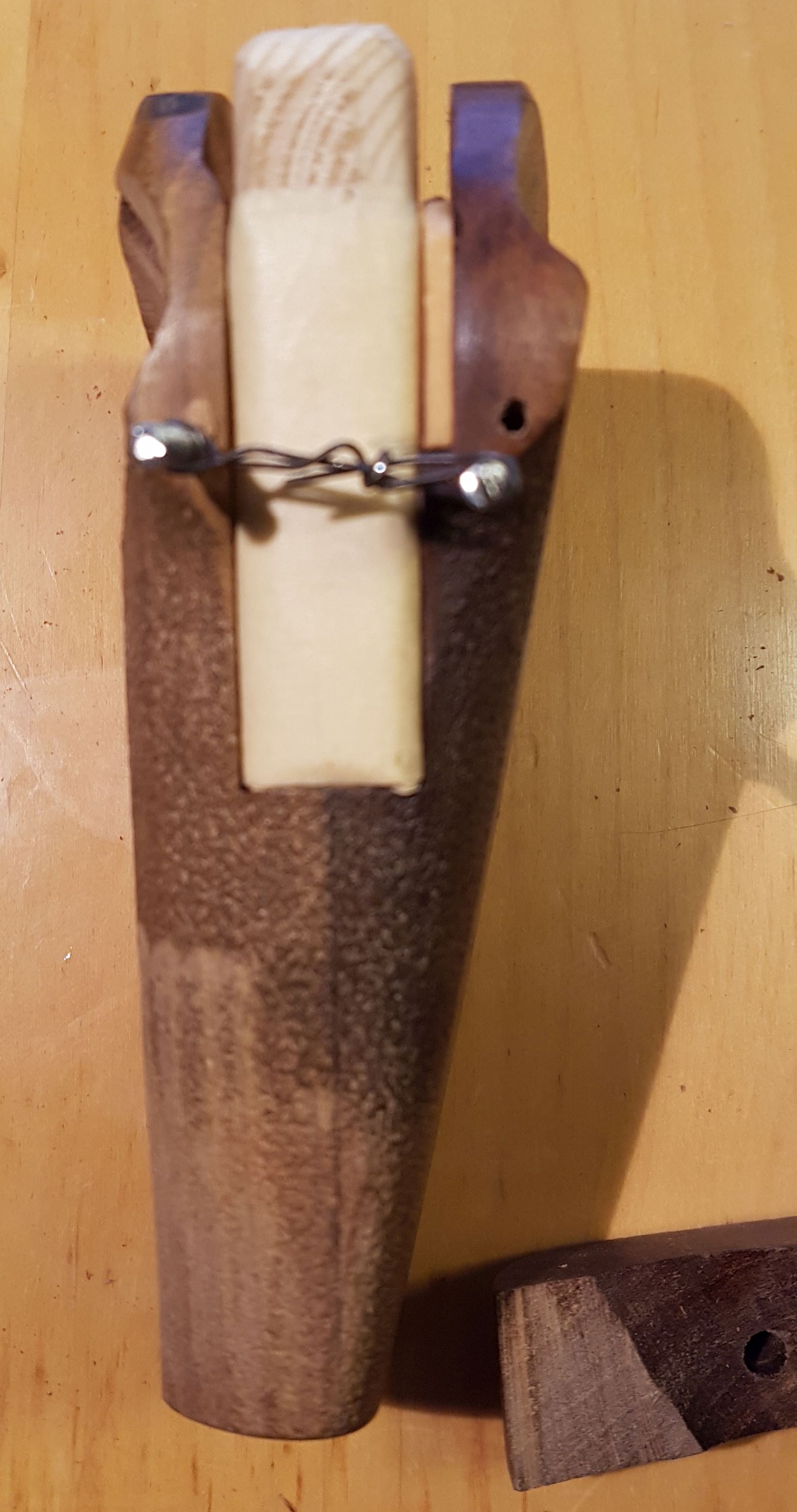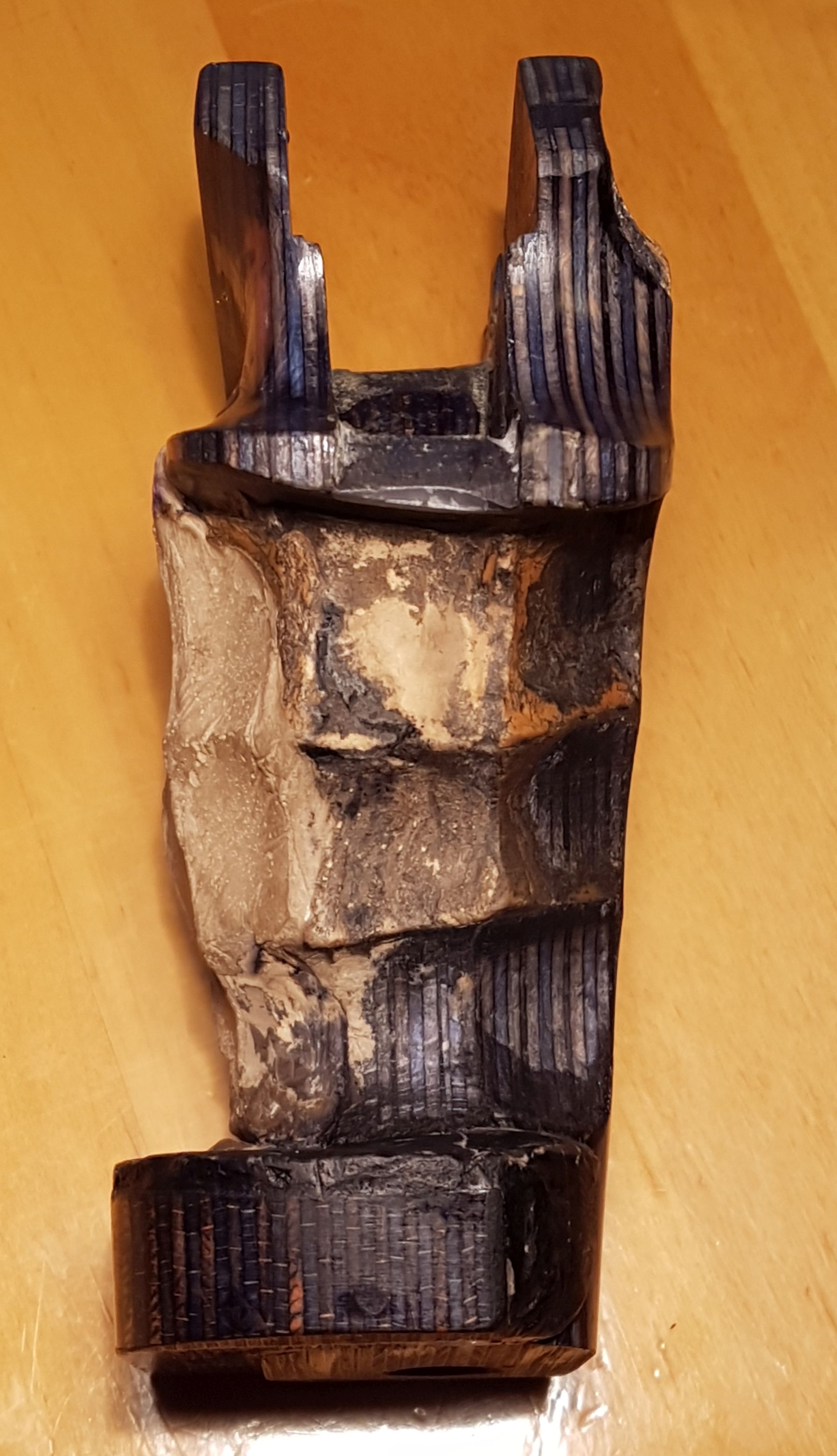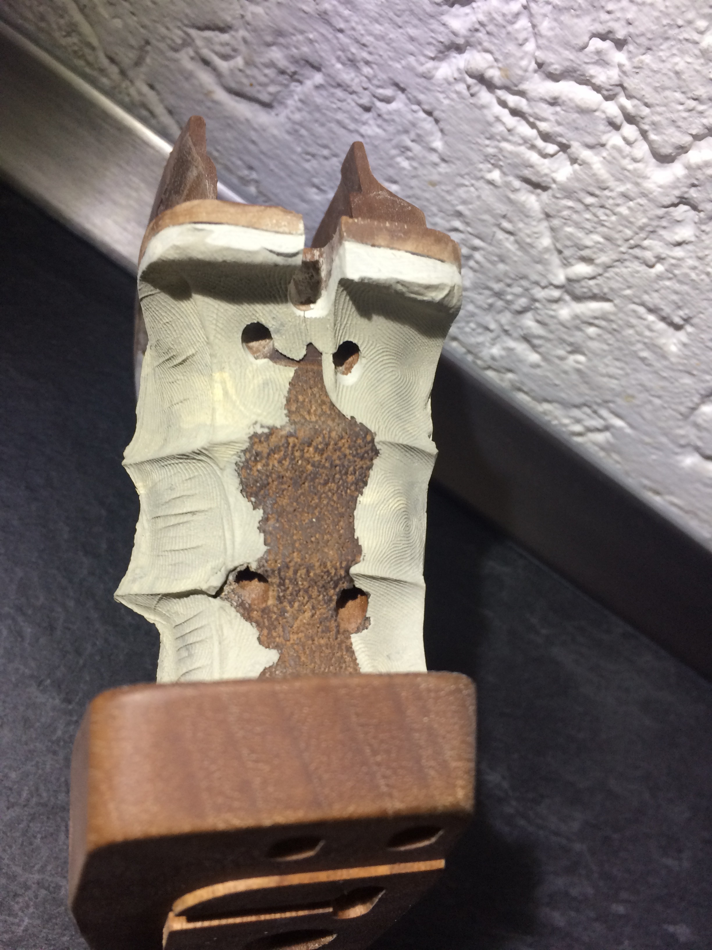 Für den blauschwarzen Schichtholzgriff habe ich dann versucht den naturholzfarbenen Holzkitt schwarz einzufärben, etwas, was nicht so wirklich von Erfolg gekrönt war. Ich werde noch mal einen anderen Holzkitt ausprobieren, aber das steht noch aus. Drum sieht der Griff so scheckig aus...![]()
