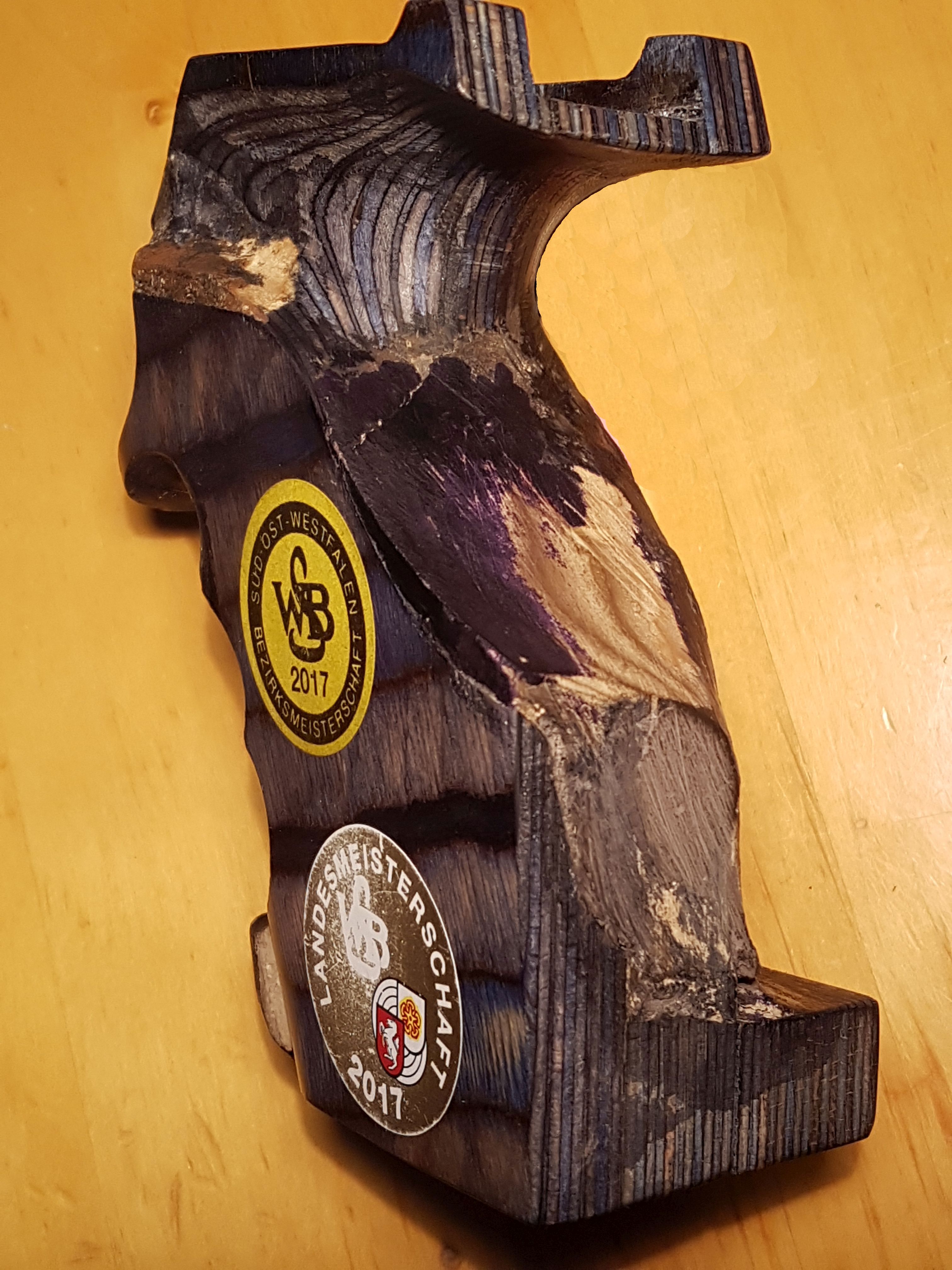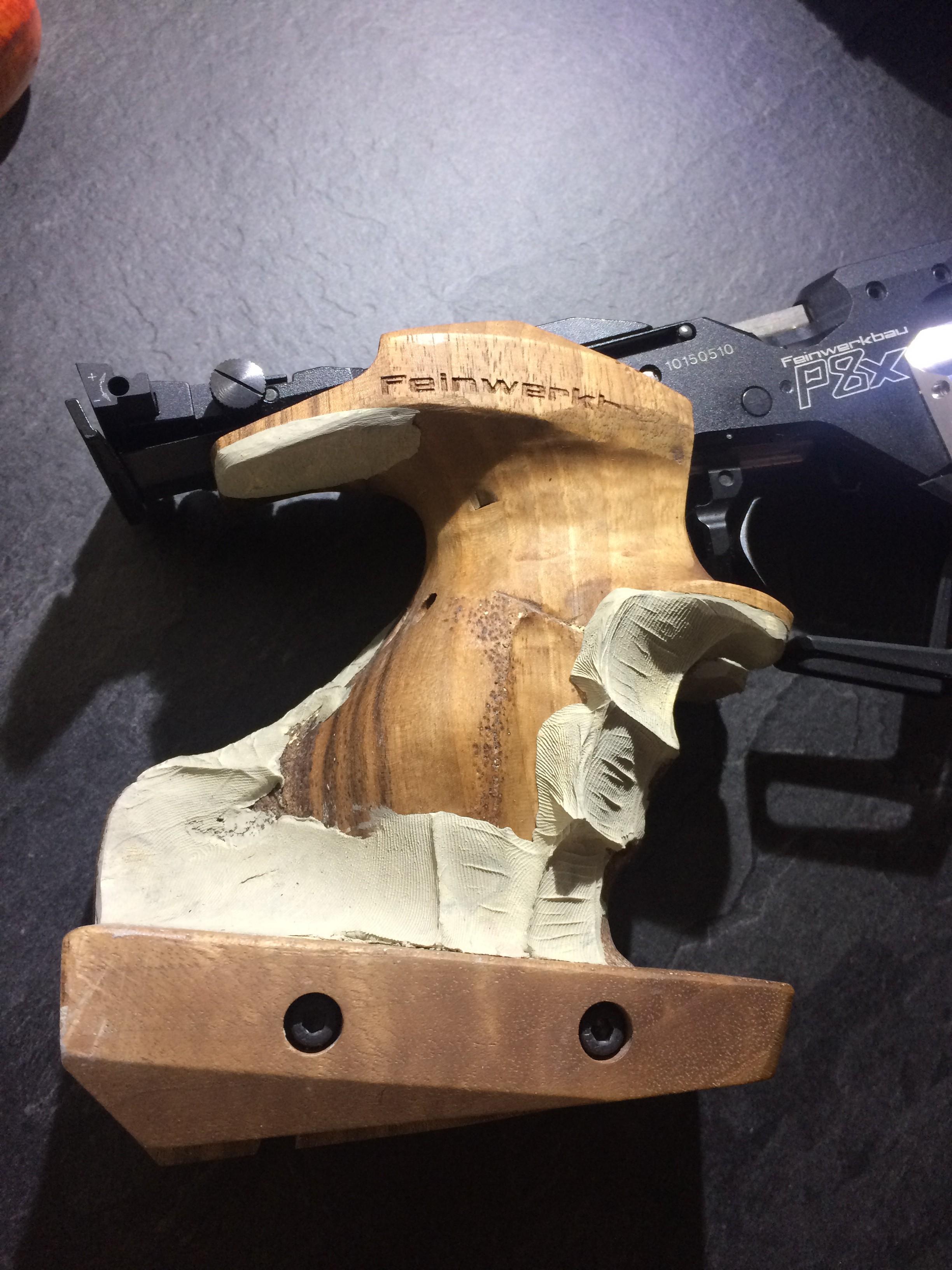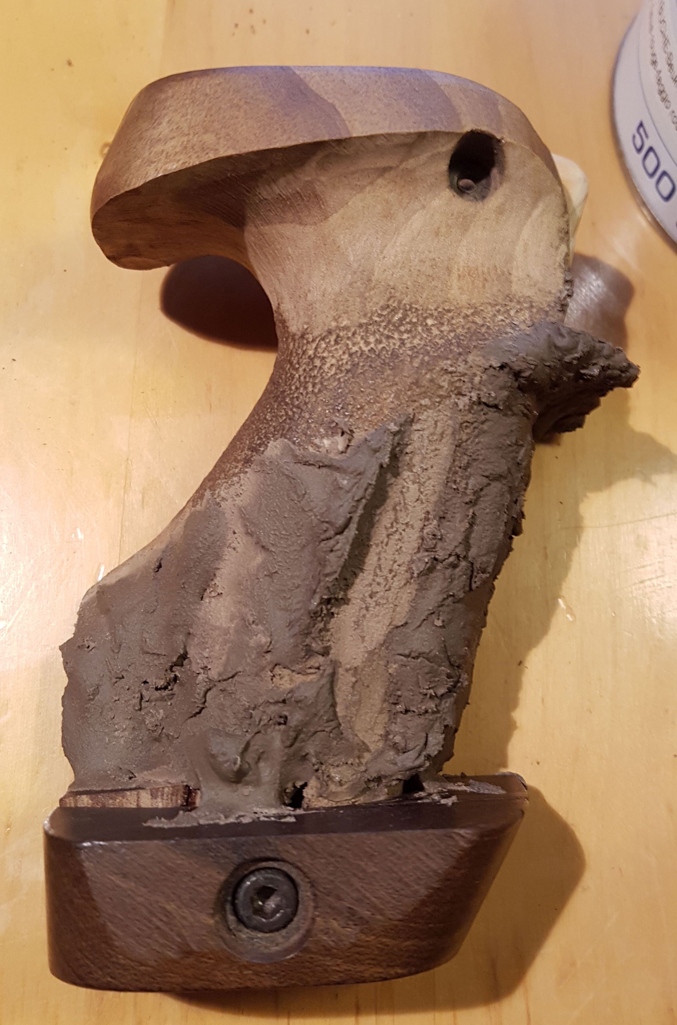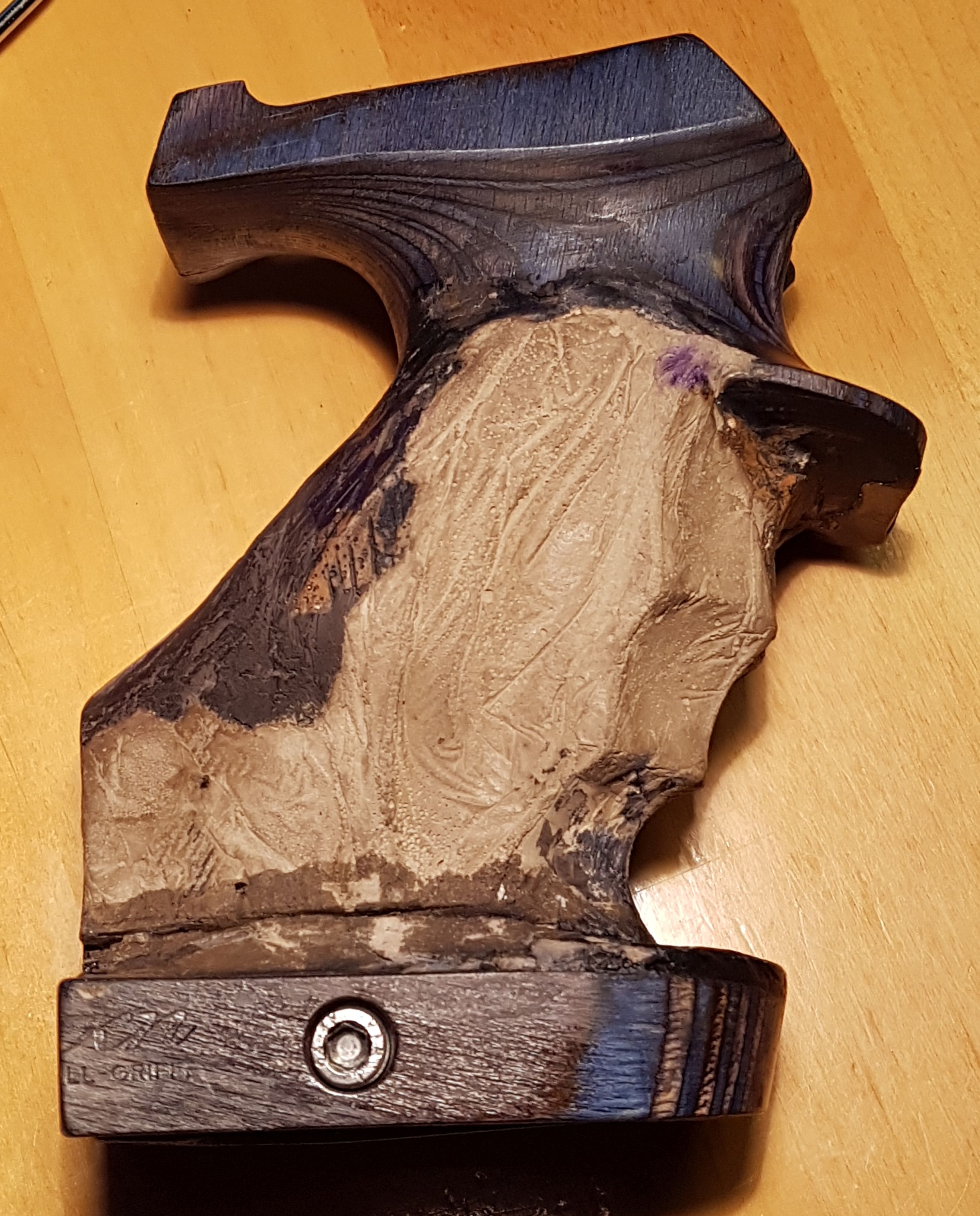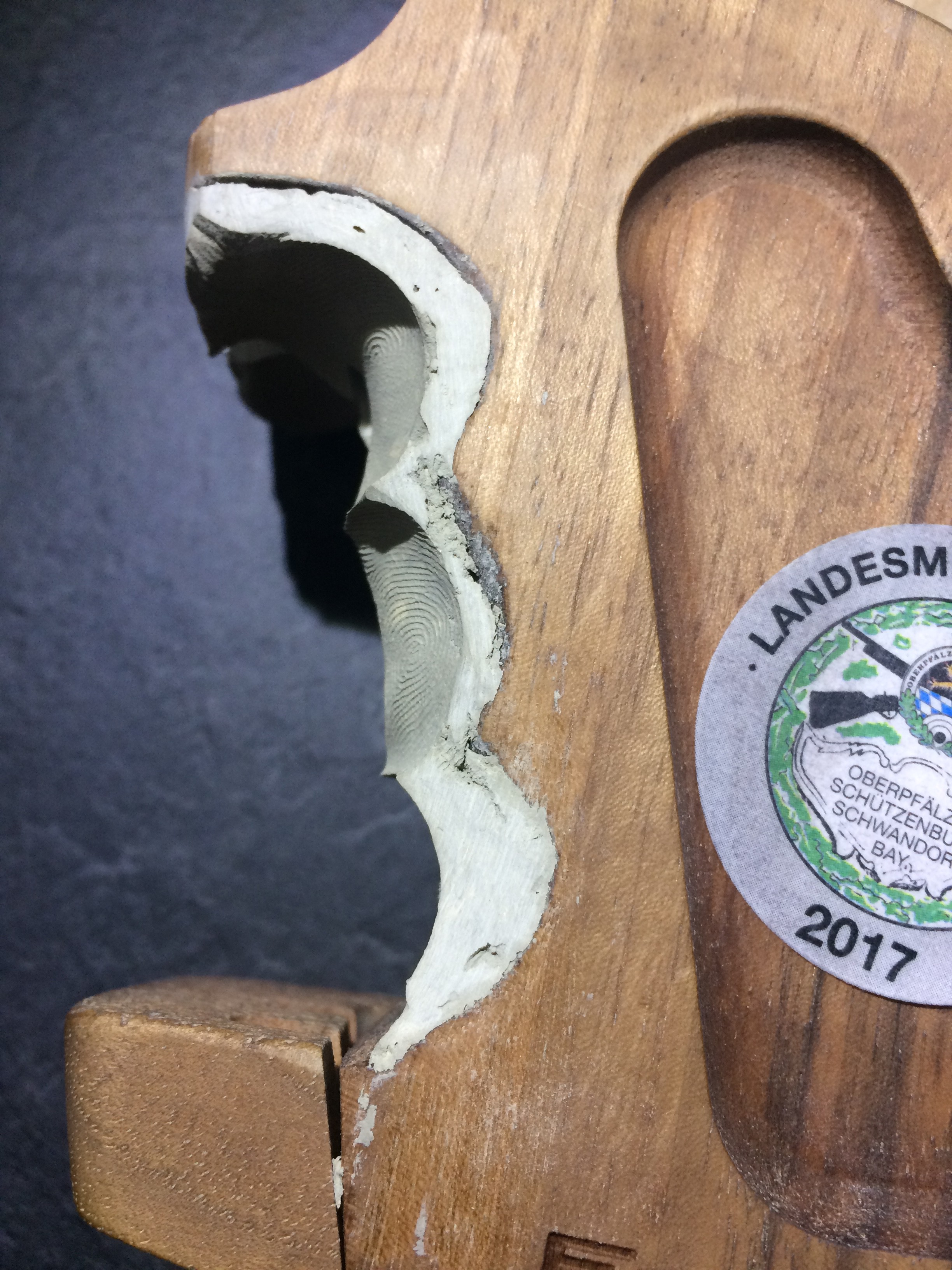 Hier ein Benelli-SpoPi-Griff, mal recht preiswert bei Frankonia erworben, umgebaut für ein GSP. Das Aufwändige was doch die Innenbearbeiteung des einteiligen Pistolengriffs. Angefangen mit einem Forstner-Bohrer, einem Dremel mit biegsamer Welle ausgestattet mit einem Dremel Fugenfräser (Art.-Nr 570) sowie einer Raspel hat dass wirklich zig Stunden in Anspruch genommen, Eingeklebt habe ich eine gekürzte und durchbohrte 9-mm-Luger-Hülse als Lager für die 5-mm-Inbus-Schraube, die den Griff mit dem Gehäuse verschraubt. Von der Außenkontur habe ich jetzt ein paar Bilder. Ich arbeitete vorwiegend mit Holzkitt und verwende aus Lösungsmittel Aceton. Das Mischen mit Aceton funktioniert bei den Produkten Zweihorn Correct und Bindulin FugenPlast problemlos. Aceton verflüchtigt sich recht schnell, was den Trocknungsprozess stark verkürzt.