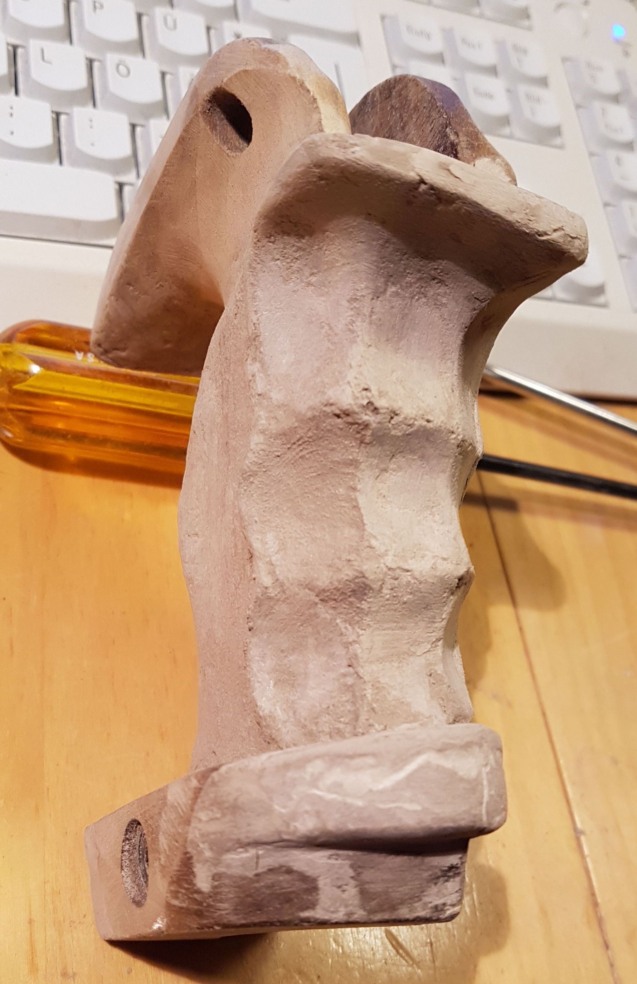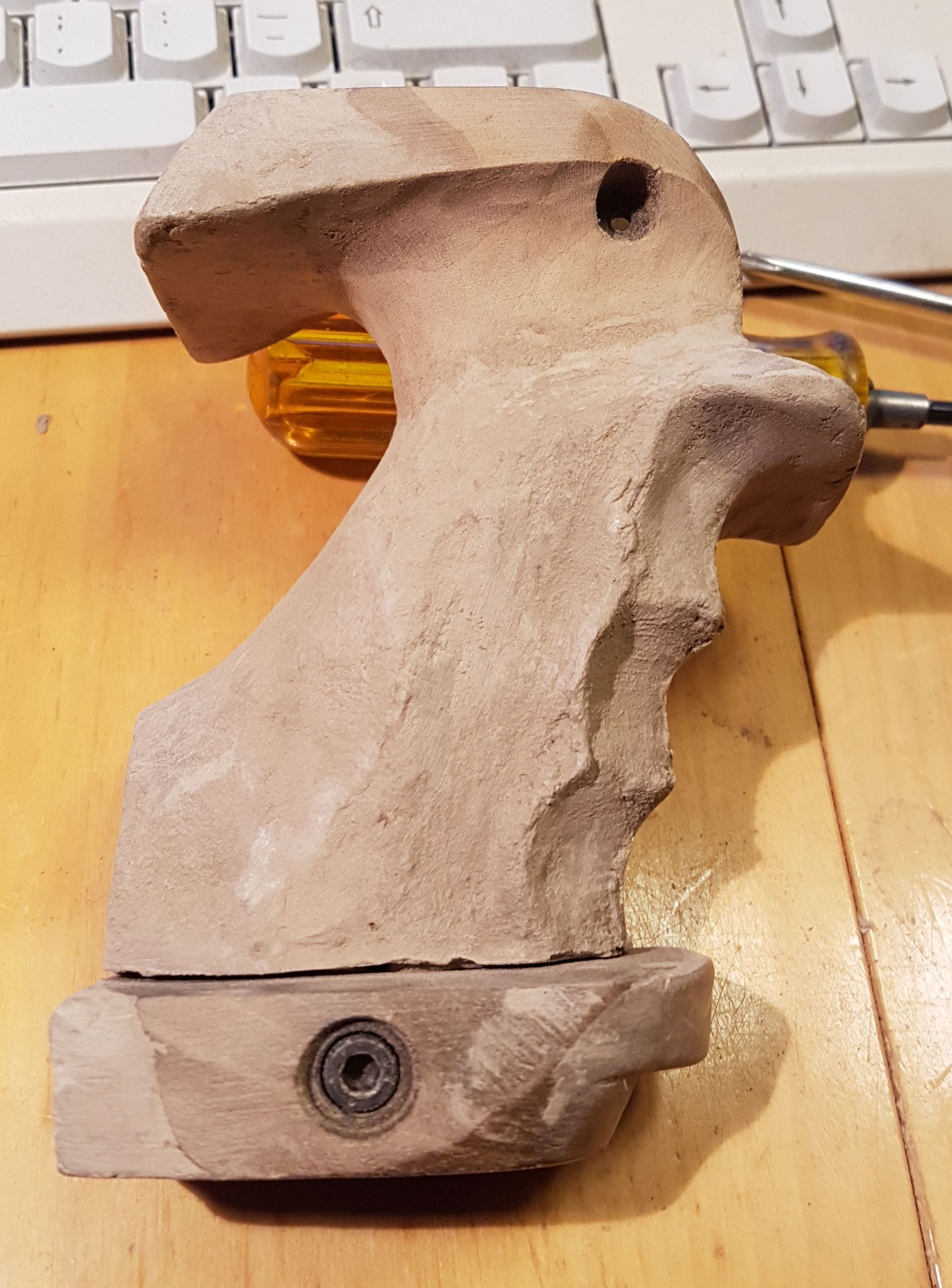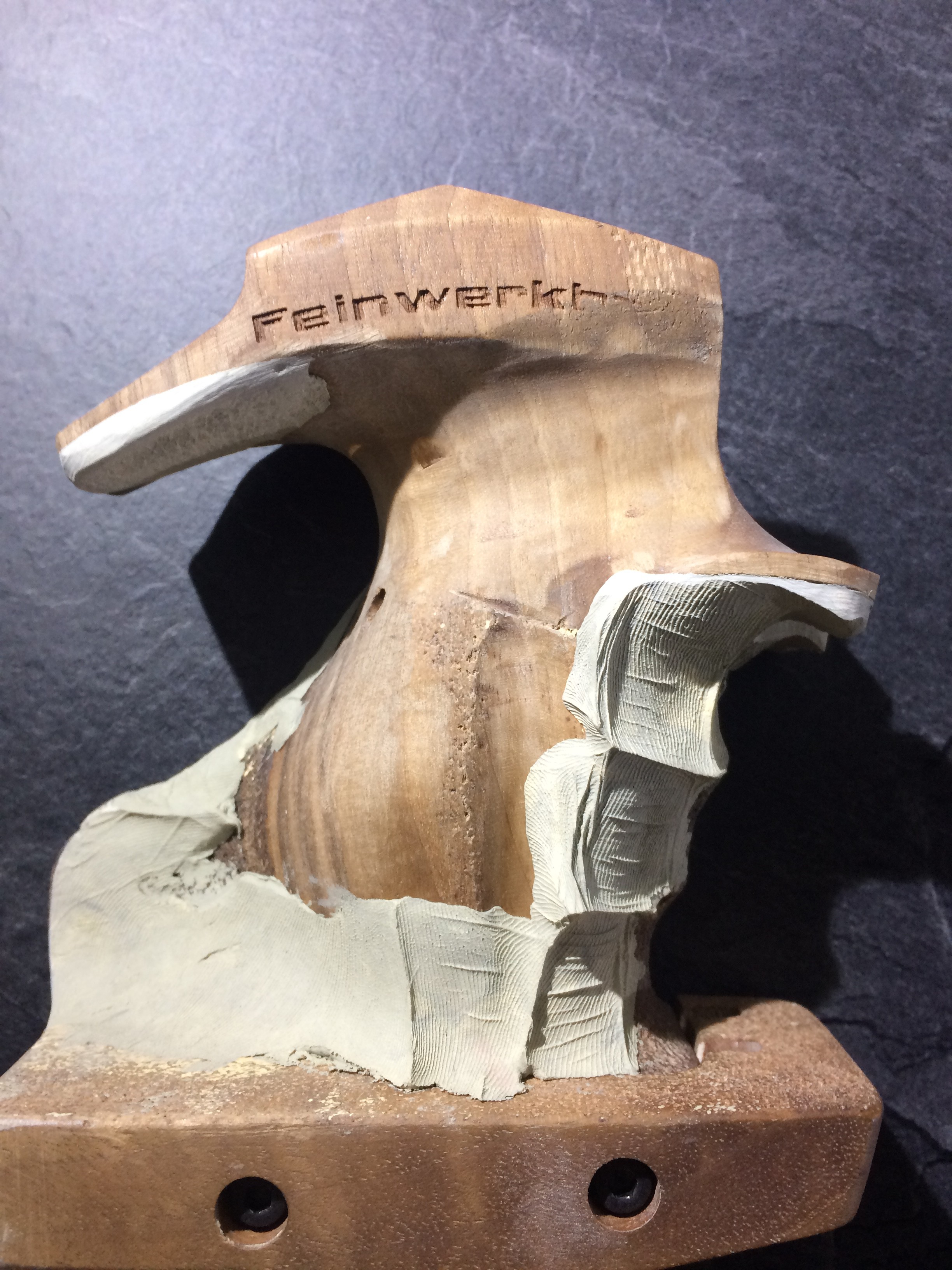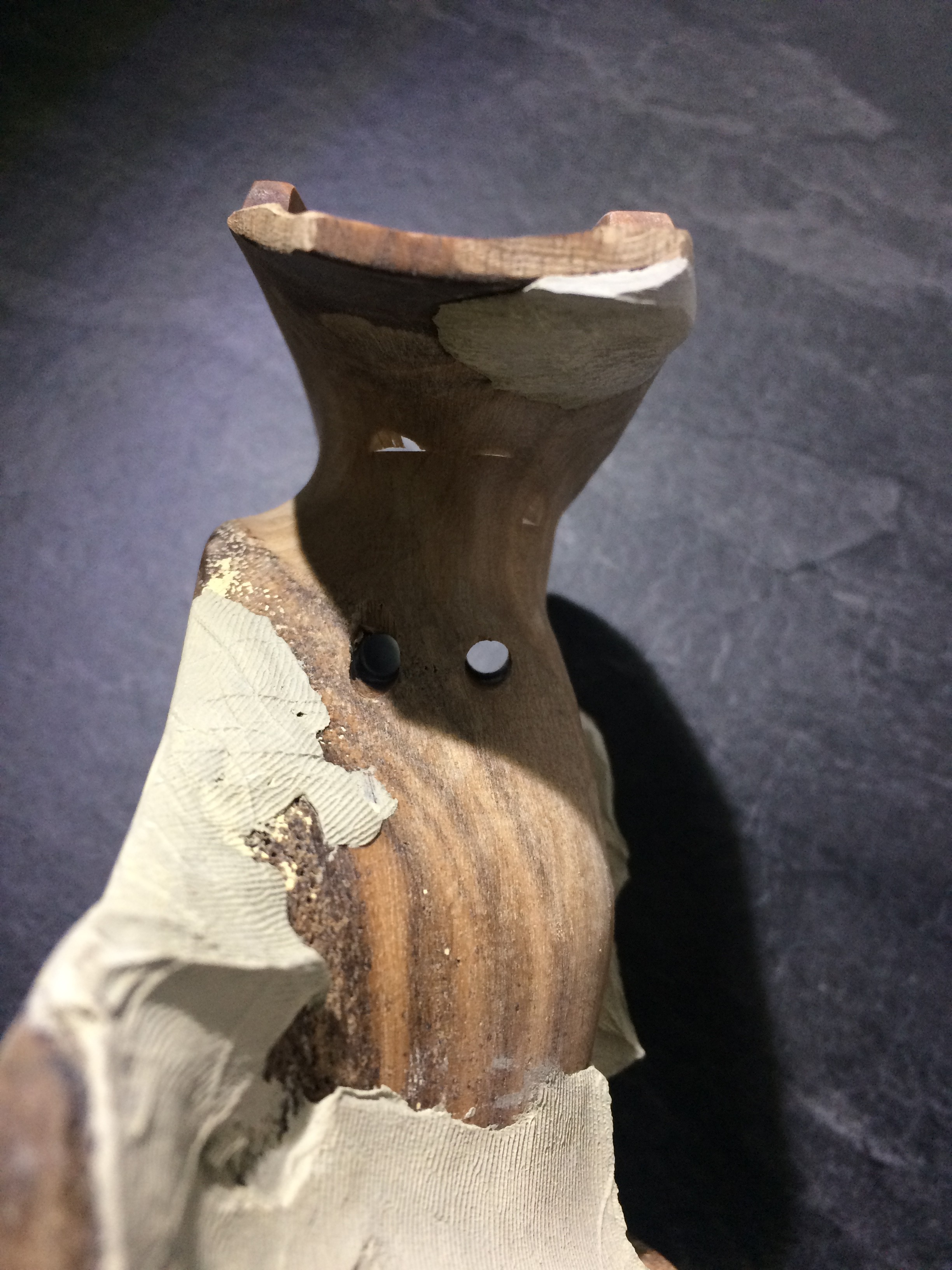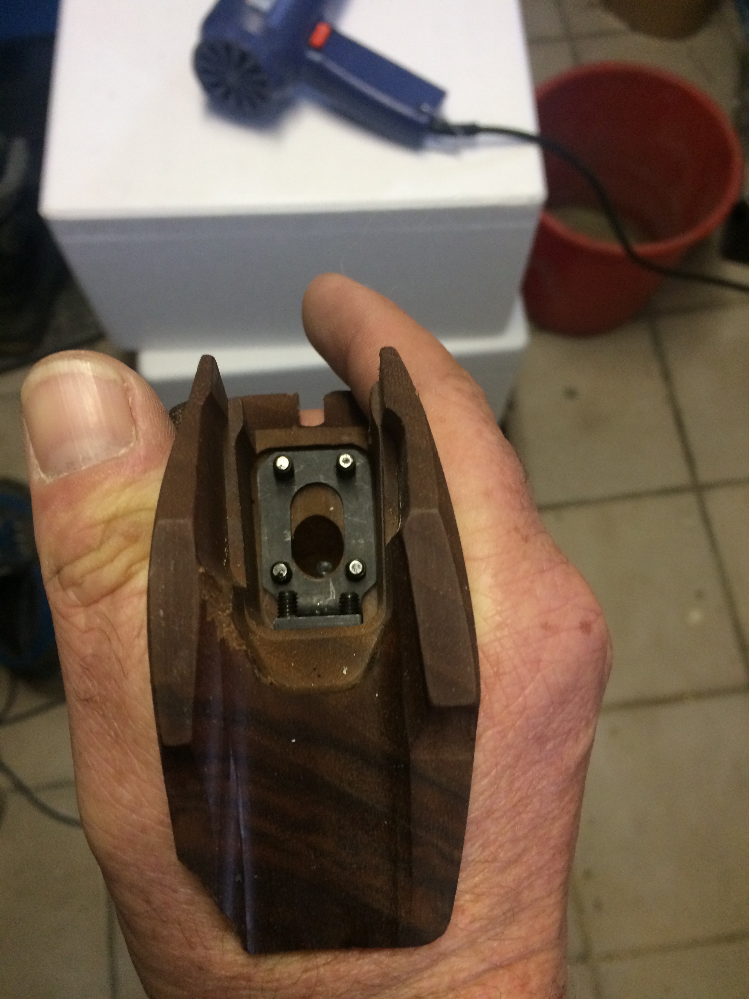 Hier ein Benelli-SpoPi-Griff, mal recht preiswert bei Frankonia erworben, umgebaut für ein GSP. Das Aufwändige was doch die Innenbearbeiteung des einteiligen Pistolengriffs. Angefangen mit einem Forstner-Bohrer, einem Dremel mit biegsamer Welle ausgestattet mit einem Dremel Fugenfräser (Art.-Nr 570) sowie einer Raspel hat dass wirklich zig Stunden in Anspruch genommen, Eingeklebt habe ich eine gekürzte und durchbohrte 9-mm-Luger-Hülse als Lager für die 5-mm-Inbus-Schraube, die den Griff mit dem Gehäuse verschraubt. Von der Außenkontur habe ich jetzt ein paar Bilder. Ich arbeitete vorwiegend mit Holzkitt und verwende aus Lösungsmittel Aceton. Das Mischen mit Aceton funktioniert bei den Produkten Zweihorn Correct und Bindulin FugenPlast problemlos. Aceton verflüchtigt sich recht schnell, was den Trocknungsprozess stark verkürzt.