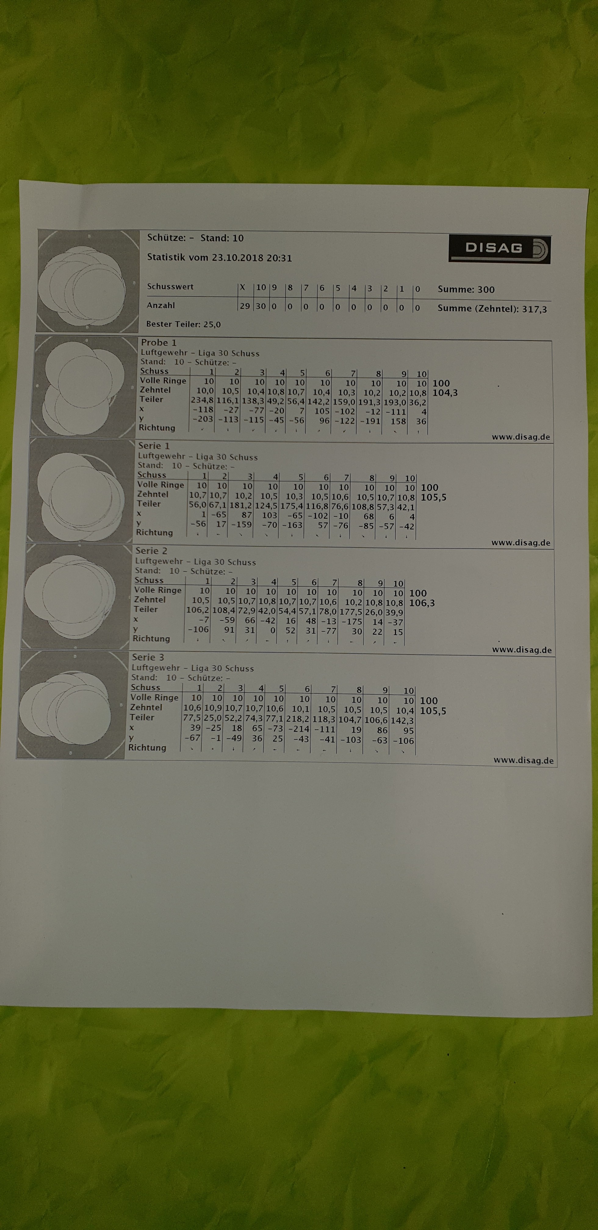 hier mein Ergebnis für LG Freihand für Oktober von gestern Abend - nach 20 Schuss auf der doppelt genommenen Trainingsmatte => die Unterschenkelmuskulatur hat es gemerkt.