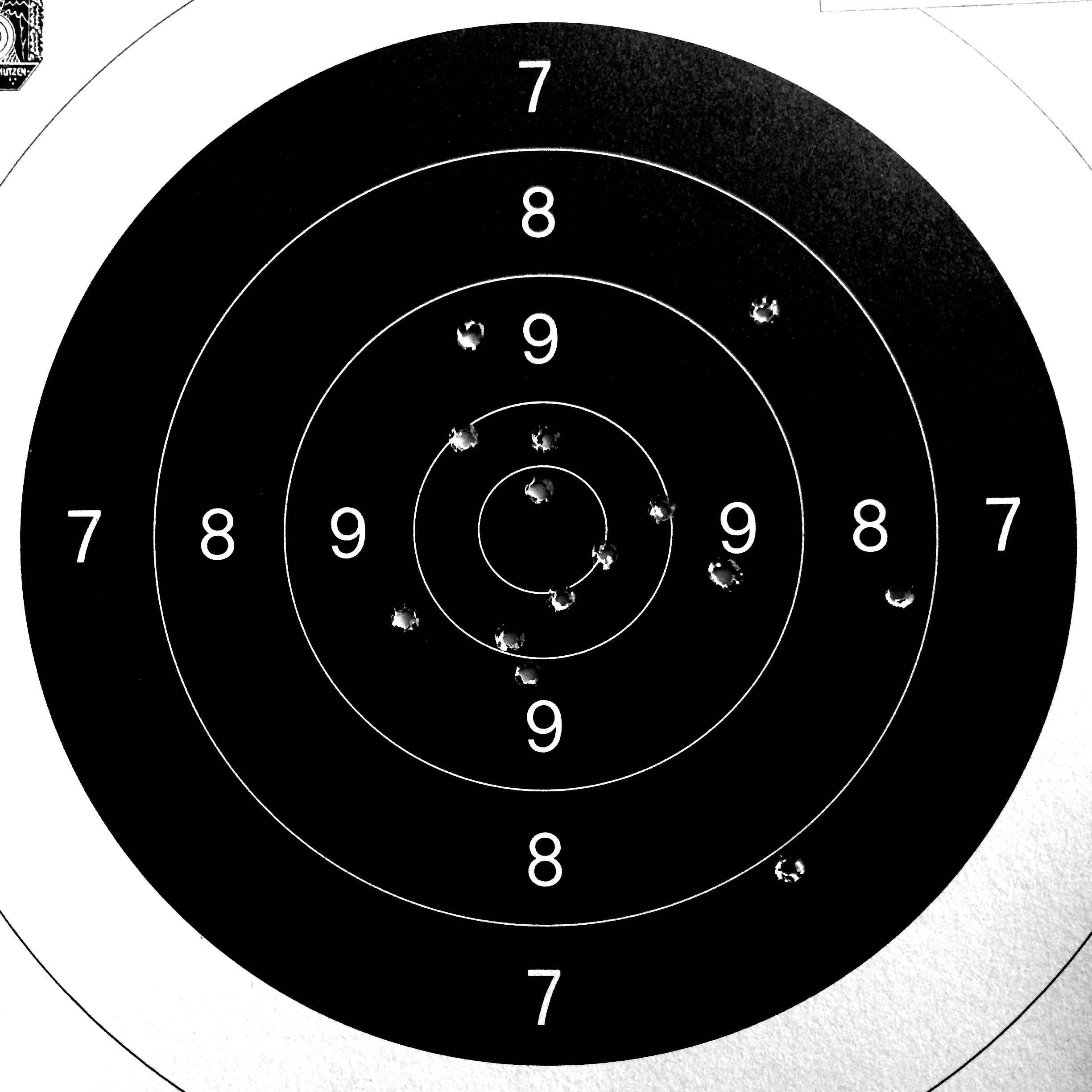 Bei der Sportpistole heute war es ganz schön kalt draußen. Die zwei 8er und die 7 rechts in der Präzision hab ich deutlich "nach rechts springen" sehen - da dreht sich die Waffe irgendwie aus der Hand, aber ich weiß noch nicht so ganz, was ich da anders mache, als bei den übrigen. Im Duell hatte ich in der Probe noch rechts liegende Schüsse (wie im September), die ich jetzt aber durch einen etwas steileren Stand erfolgreich "bekämpfen" konnte (das hatte sich zwischenzeitlich im Training herauskristallisiert, dass das "hilft", aber so ganz verstehe ich es noch nicht). Aber mit jedem Durchgang hatte ich mehr Schwierigkeiten mit dem Abzug, weil meine Finger immer kälter wurden und nicht so wollten wie ich. Im letzten habe ich dann eine 6 rechts oben reingedrückt, weil der Abzug so gar nicht losgehen wollte. An die Kälte muss ich mich echt wieder gewöhnen, das konnte ich schon mal besser.