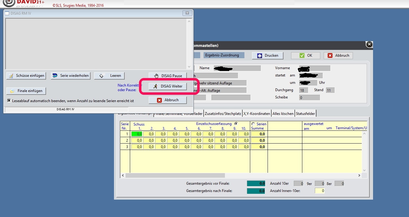 Erst nach einem klick auf die Schaltfläche DISAG Weiter kommt das akustische Signal und die erste Scheibe