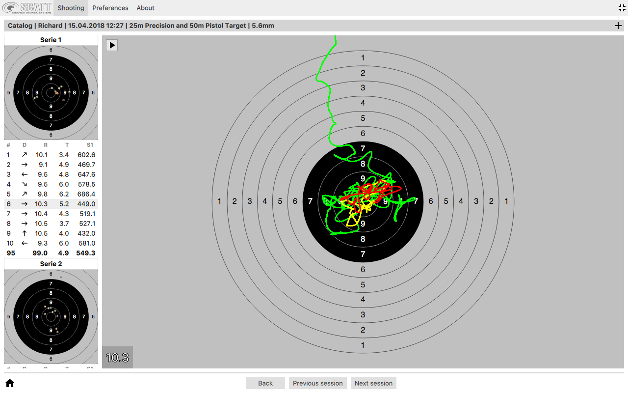 Für die Auswertung sind schon ein paar interessante Gimmicks dabei. z.B. Haltebereich 6er und 9er Ring, "Aiming Zone"-Anzeige. Den einzelnen Schuss kann man aber leider nicht mehr anklicken und durchlaufen lassen. Muss hier in der zeile angewählt werden.