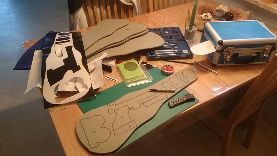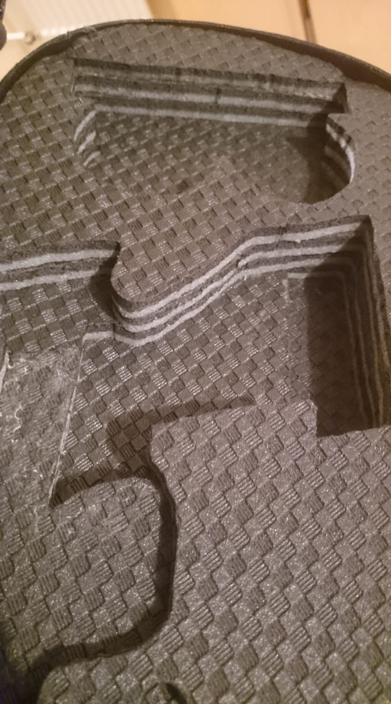 Verwendet wurden ein Geigenkoffer (1/2) und eine ISO-Matte von Aldi. Neben Cutter und Skalpell habe ich viel mit einem heissen Draht gearbeitet.