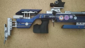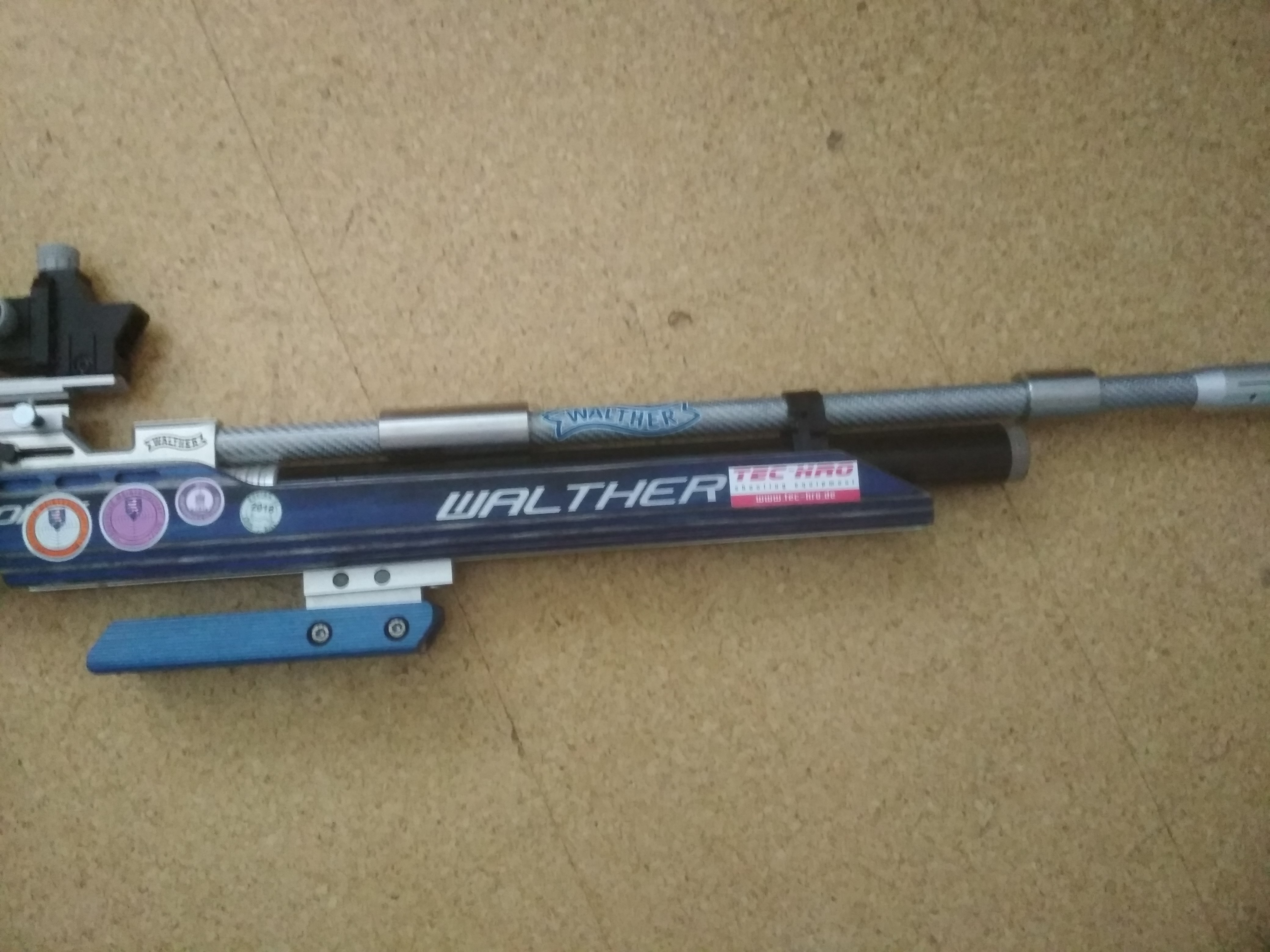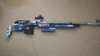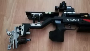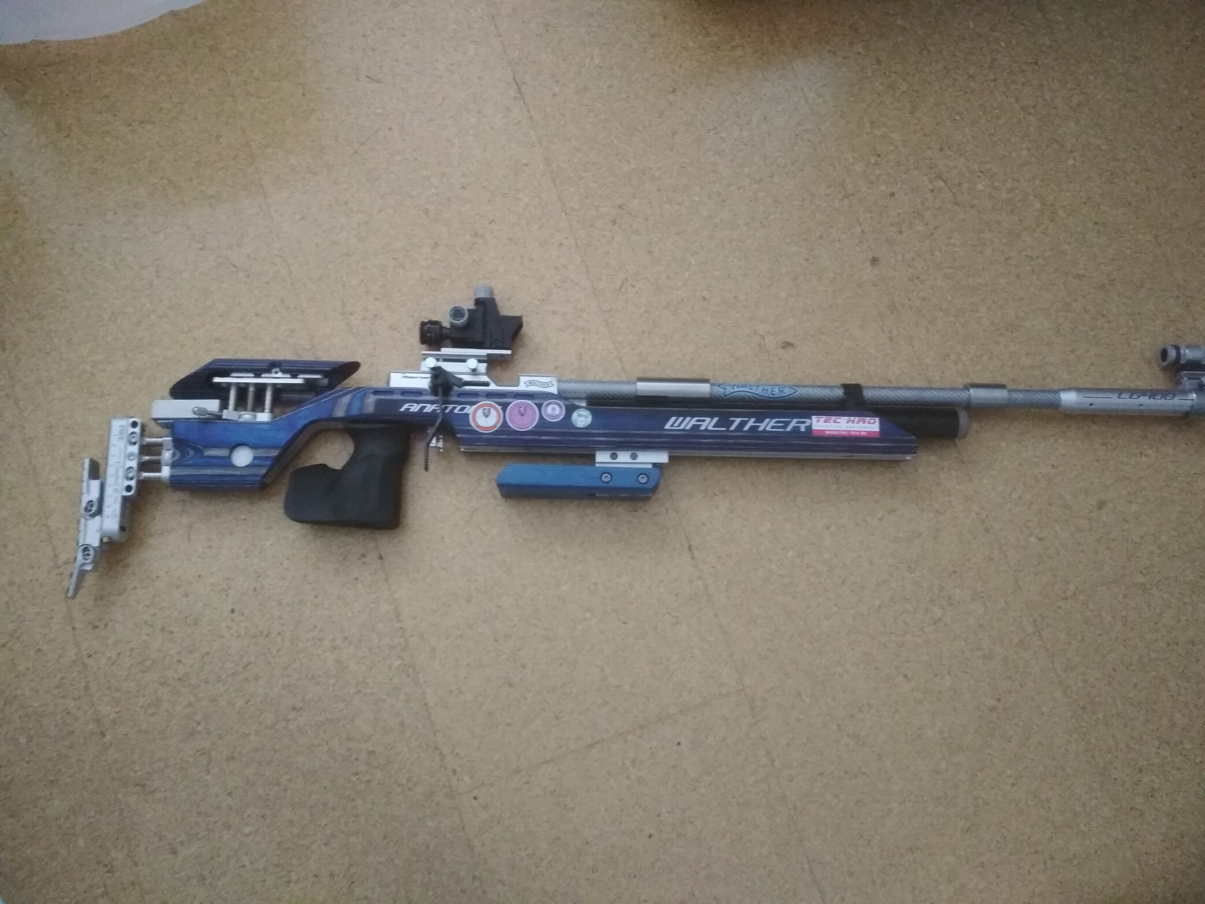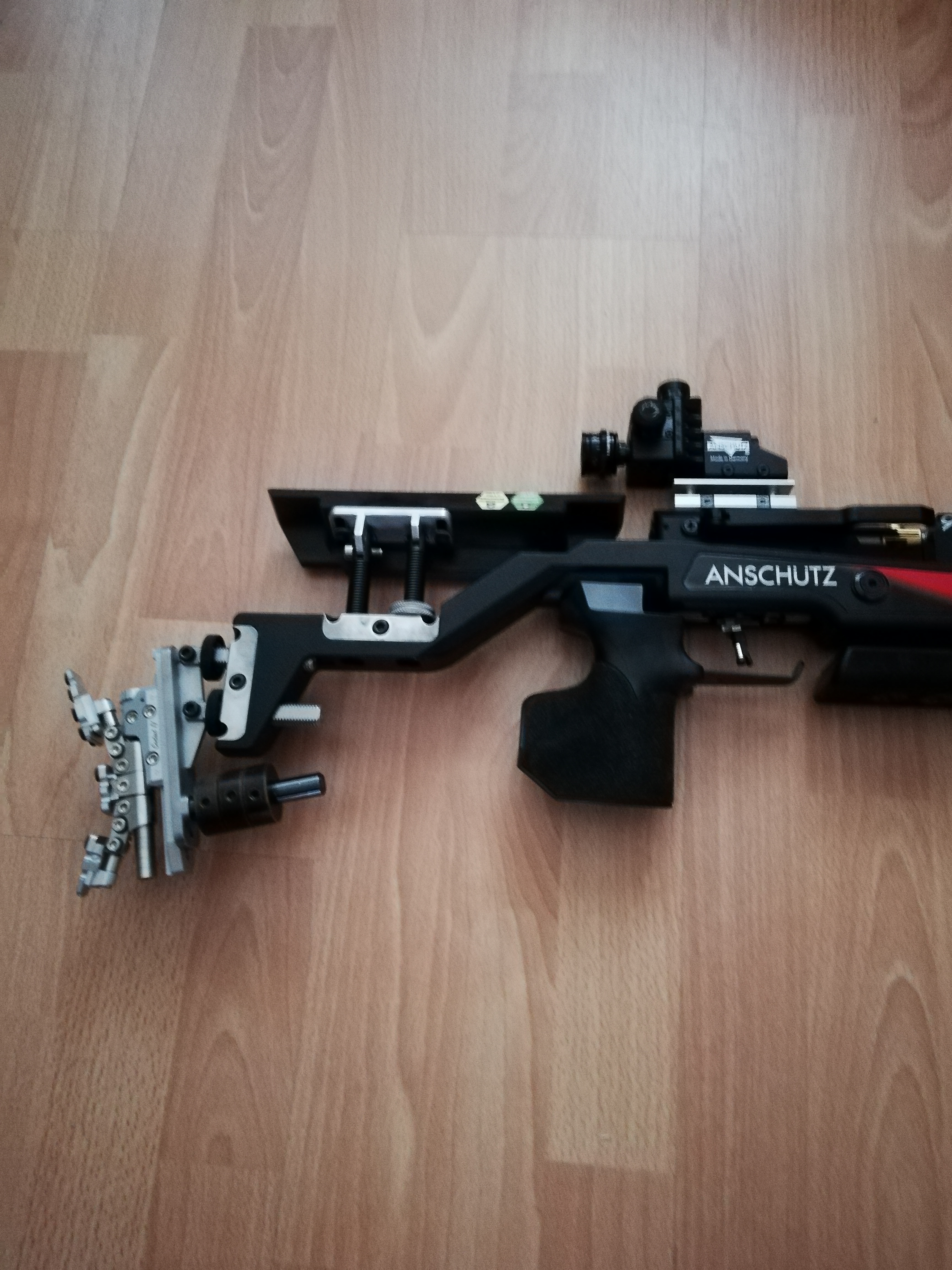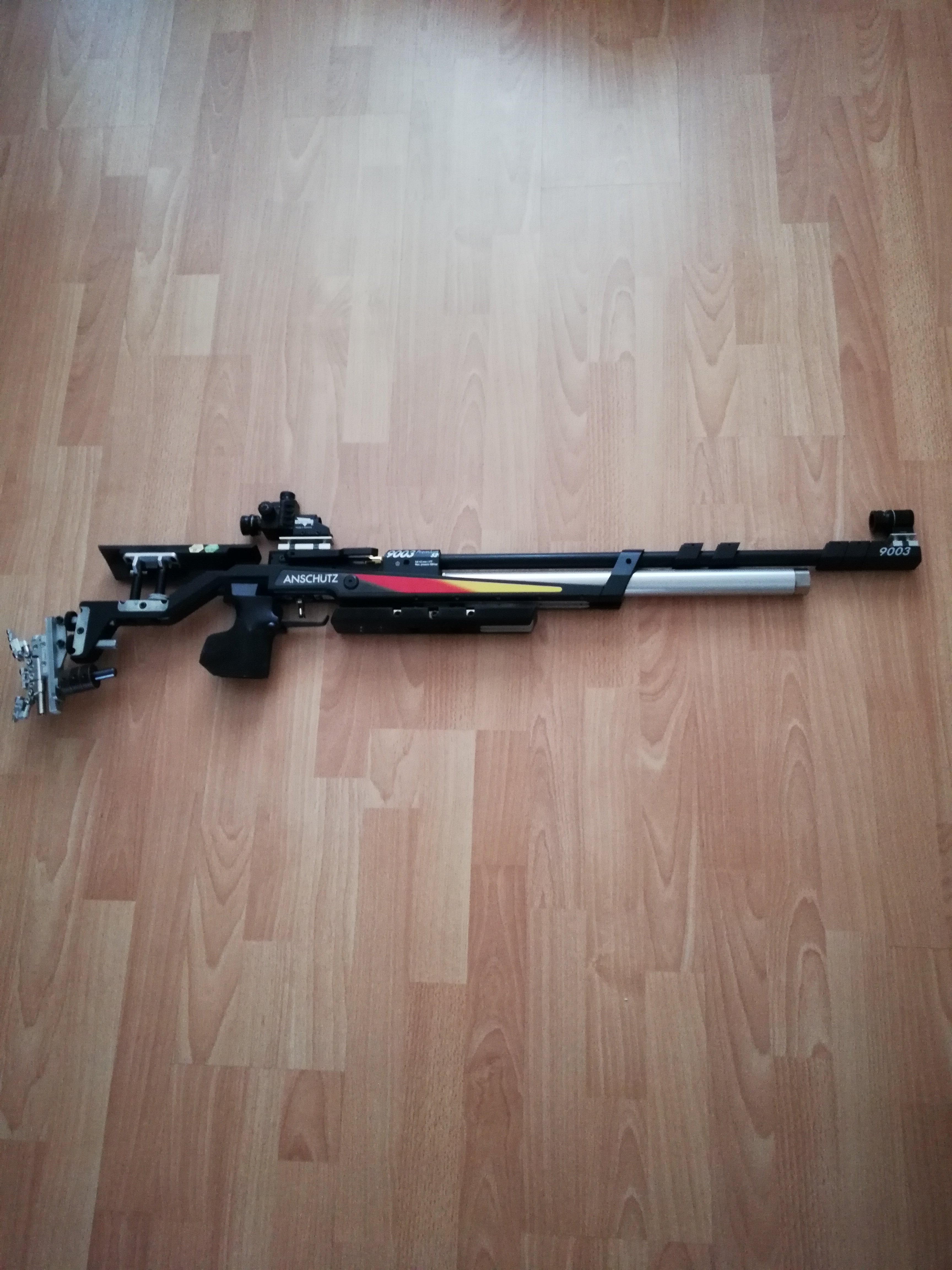 • Mein Gewehr ist ein Anschütz 9003 S2. Das System wurde vor 3 Jahren neu gekauft, der Schaft hat schon ca. 14 Jahre auf dem Buckel. Der nachfolgende Schaft den Anschütz herausbrachte, liegt mir nicht und hat so Einiges an Nachteilen, wie ich finde. Es ist eine MEC Kontakt IV, sowie ein verstellbares Ringkorn von Centra, M22, verbaut. Die Laufgewichte sind original Anschütz, die Gewichte am hinter-Schaft Marke Eigenbau. Der Abzug ist ebenfalls von MEC. Das Diopter ist von Anschütz, 20er Rasteneinstellung, die Iris von Centra. Mit diesem Teil liege ich zw.