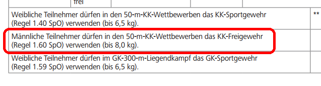 Mehr als merkwürdig finde ich auch, dass man bei den Waffen der Kk-Wettbewerbe, wo die Formulierung unterhalb der Disziplintabelle gilt, kein Sternchen steht, damit man nach diesen Hinweisen überhaupt sucht.