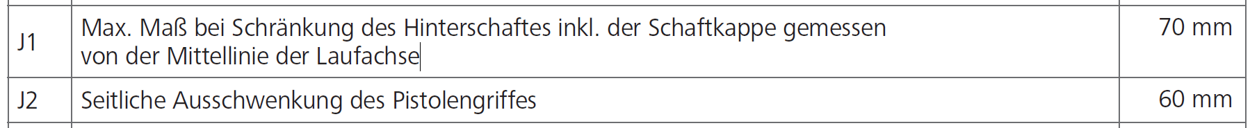 J1: "Max. Maß bei Schränkung des Hinterschaftes inkl. der Schaftkappe gemessen von der Mittellinie der Laufachse" = "70mm"