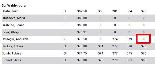 Das Ergebnis von Abdullah wird wohl als unvollständig gewertet, da sich kein 40. Schuss nachweisen ließ und insofern Ziffer 1.5.1 der Ausschreibung angewendet. Nur die Verpflichtung zu einem 40. Schuss sah auch die Berufungsinstanz nicht.