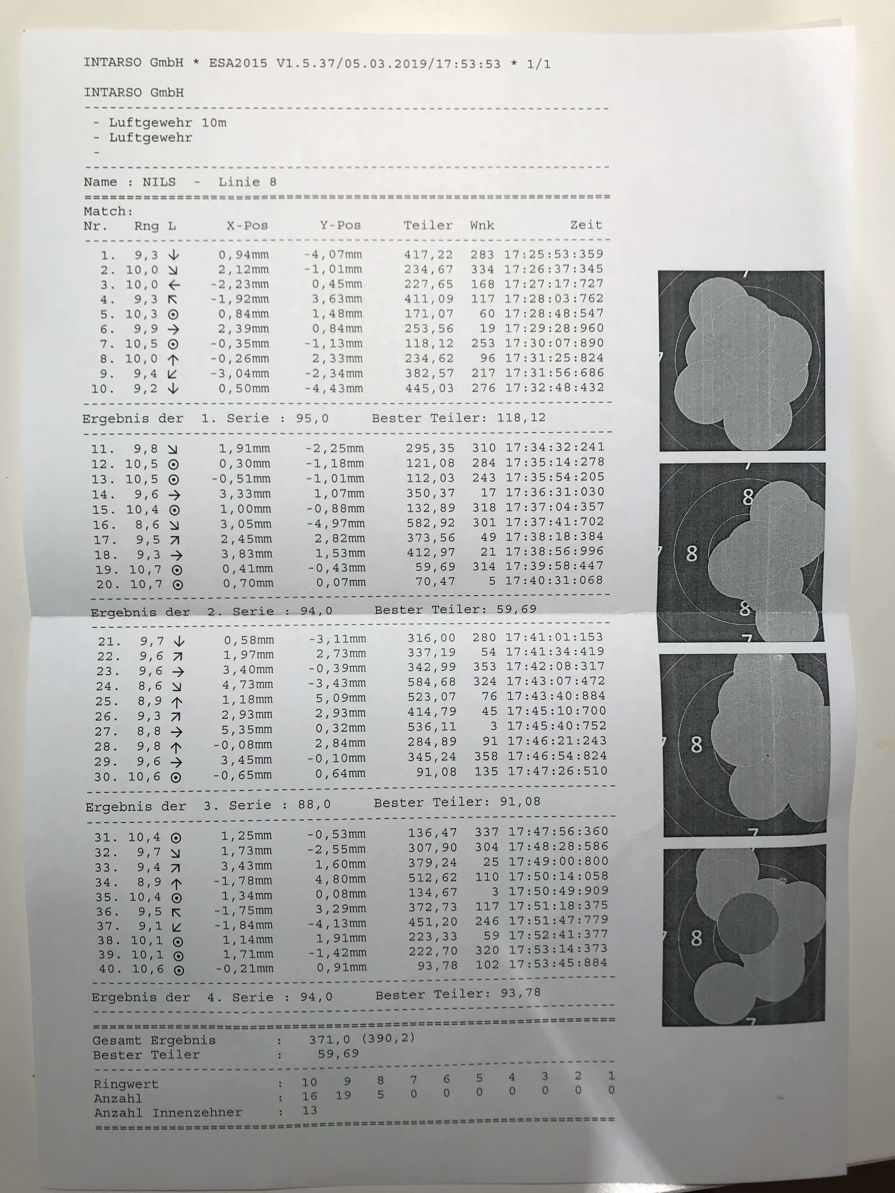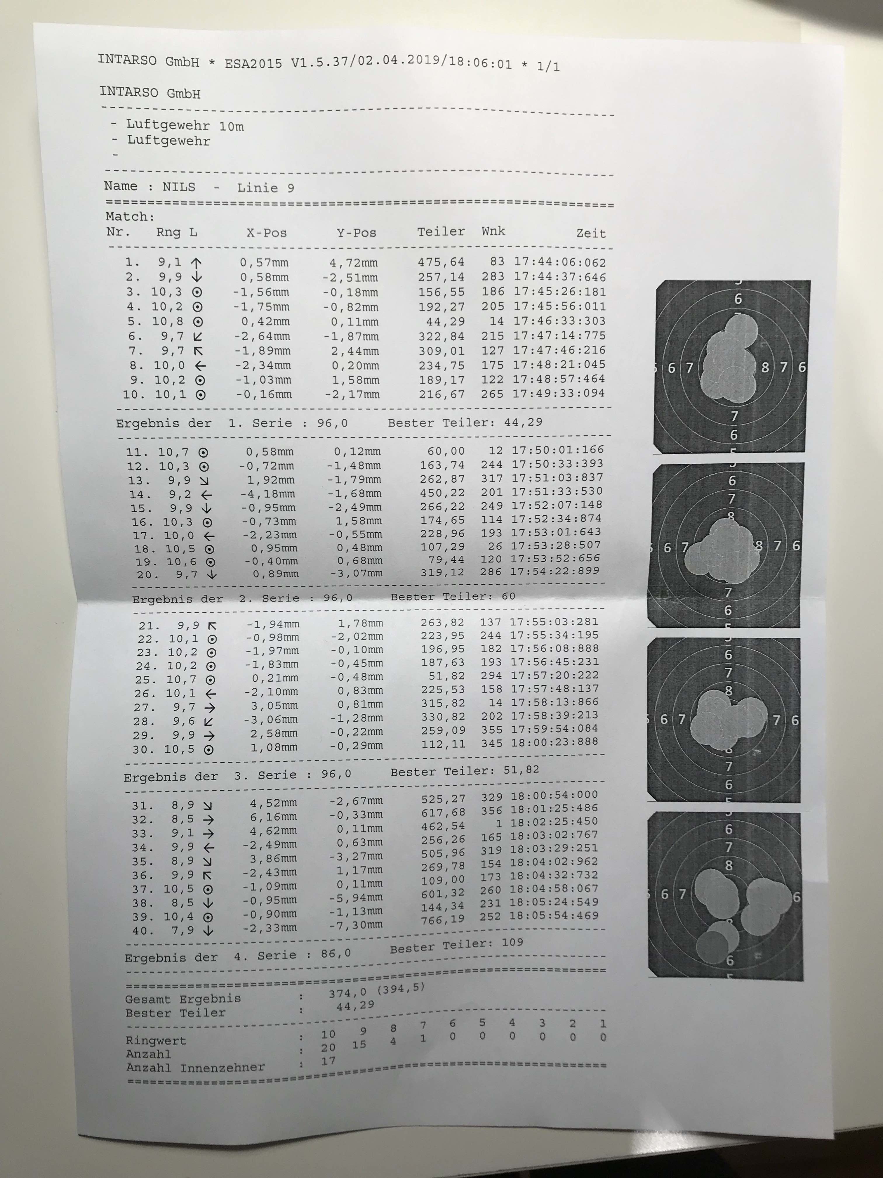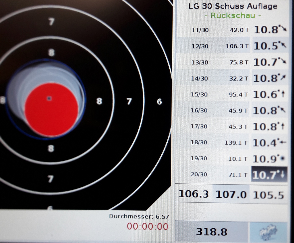 1/10tel Wertung: 106,3 / 107,0/ 105,5 = 318,8 Ringe