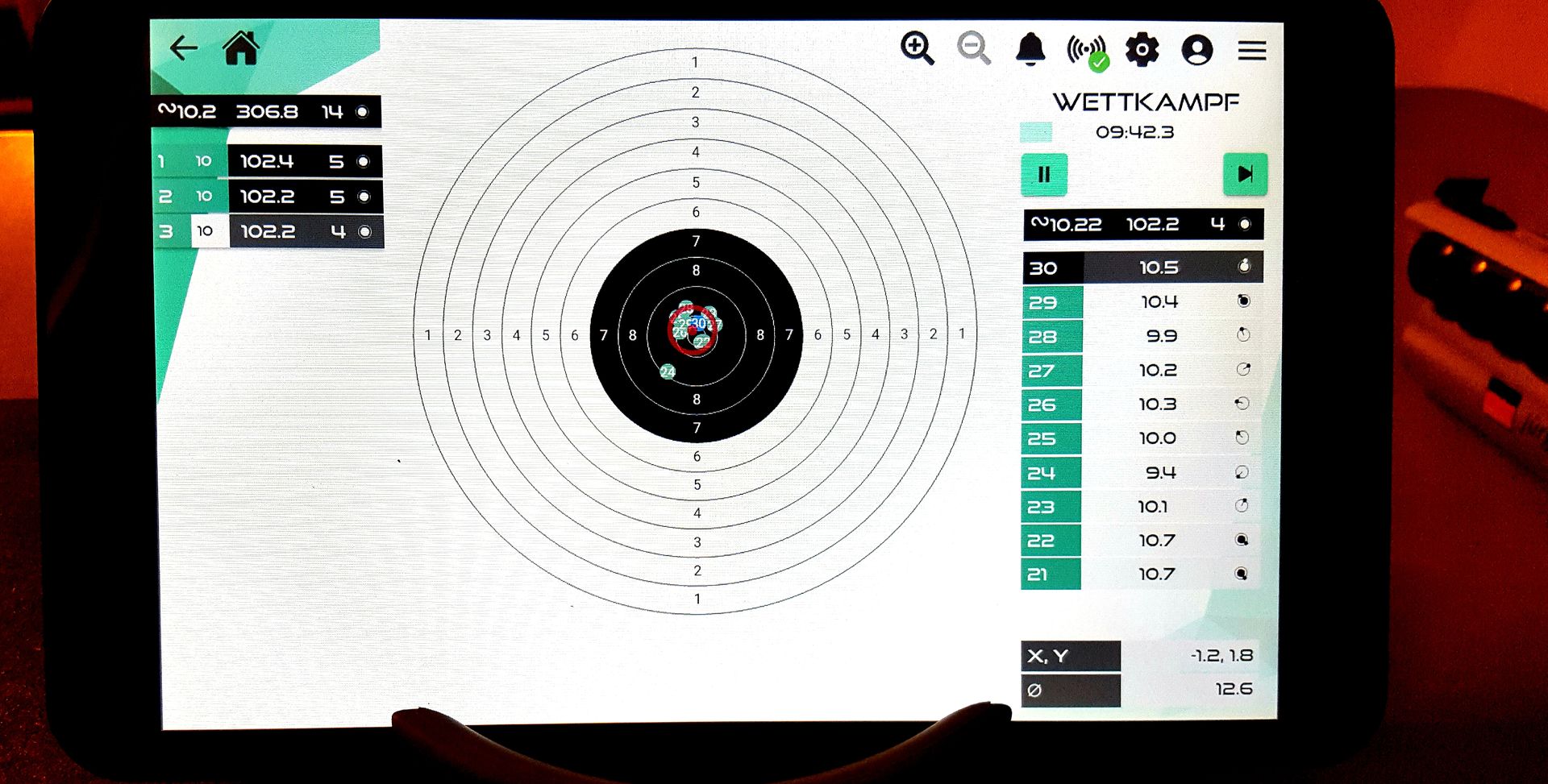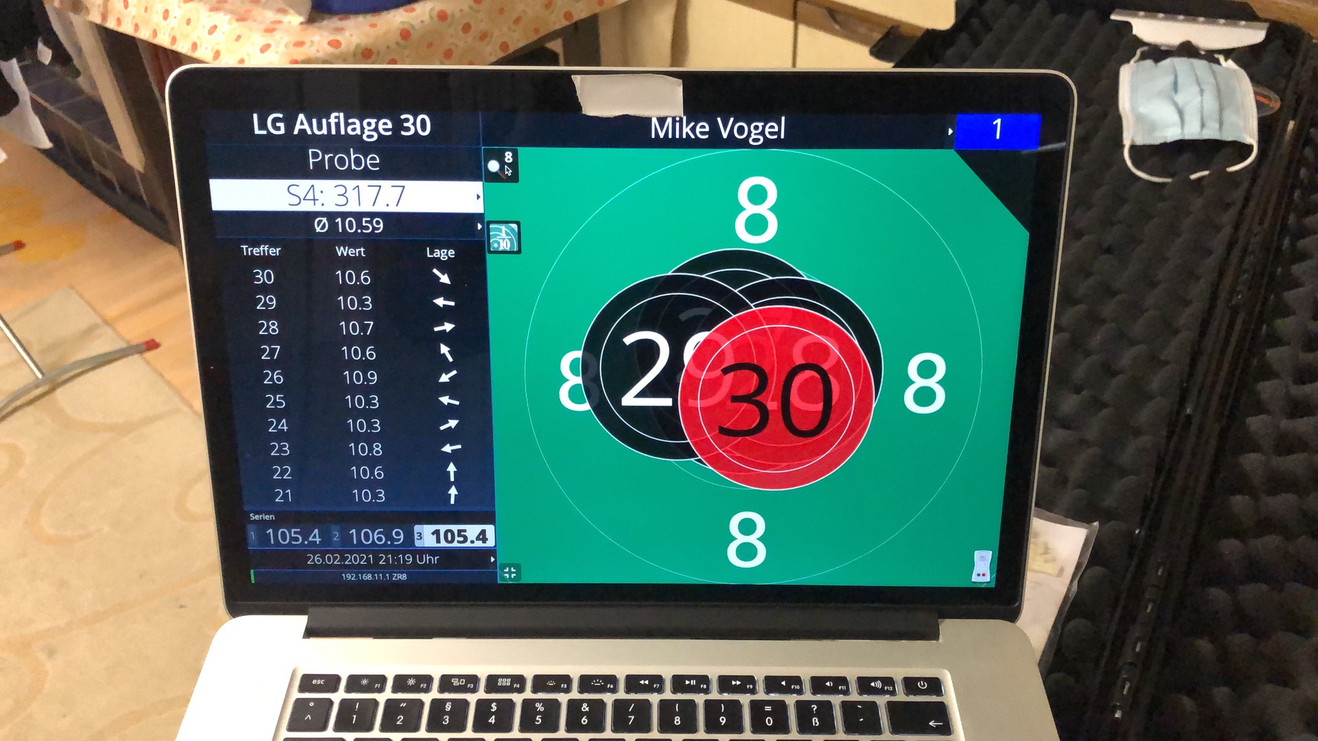 So, Sportquantum S10 montiert und in Betrieb genommen. 9 Munuten für die Maueranker zur Befestigung der 12,5 kg Zielscheibe gebraucht und 1 Minute für das 1. Hochfahren und Verbinden des Tablets. Gleich mal einen Wettkampf LP Auflage geschossen- Visierung noch nicht ganz optimal auf Zielscheibe eingestellt- aber schon mal gut.![]()