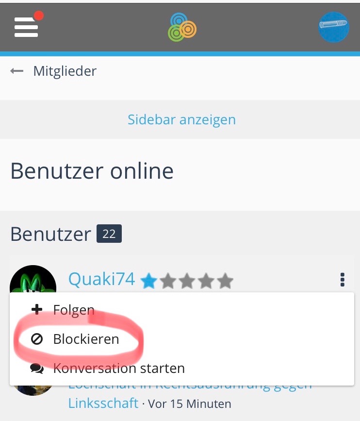• Auf „Benutzer online“ am unteren Ende der Seite, shan..23 raussuchen und dort an der rechten Seite zu diesem Benutzer in der Liste das Menü aufklappen und „Blockieren“ auswählen. Dann hat man zumindest aus dieser Richtung für die Zukunft Ruhe.