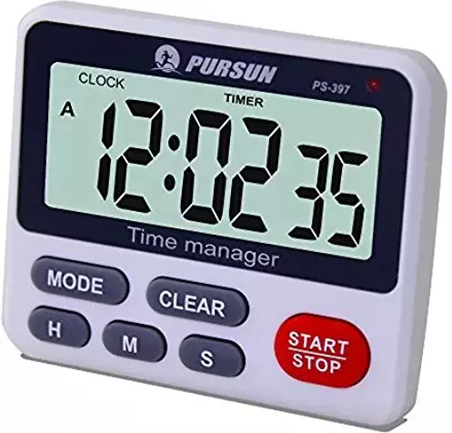 Entdeckt habe ich einen Timer bei Amazon, der eine Sekunden-Anzeige von ca. 17 mm hat. Der Timer ist abschaltbar (schon somit die Batterien) und eine Stummschaltung ist auch möglich.