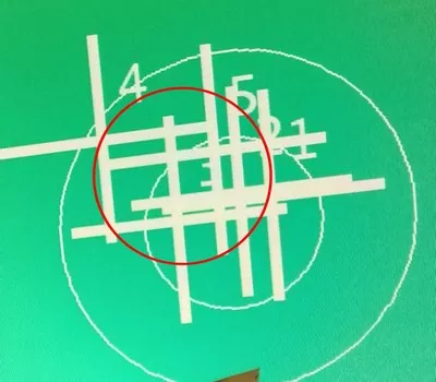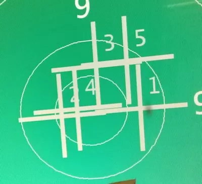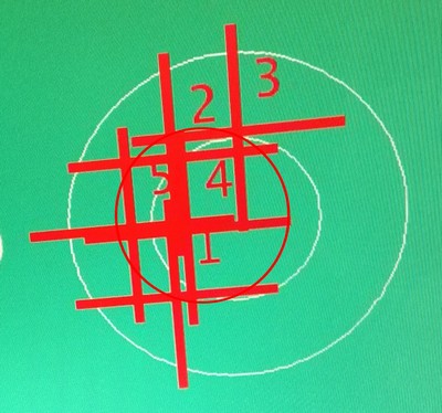 • Auf Papierscheiben. Anbei ein Bild, das wir uns selbst erstellt haben (50 x 50cm mit 2,5cm Raster). Die Blöcke mit den Strichen dienen zum justieren. So erkennen wir auch die Lage einer Muni, ob sie z. B. höher schießt als die anderen Sorten.