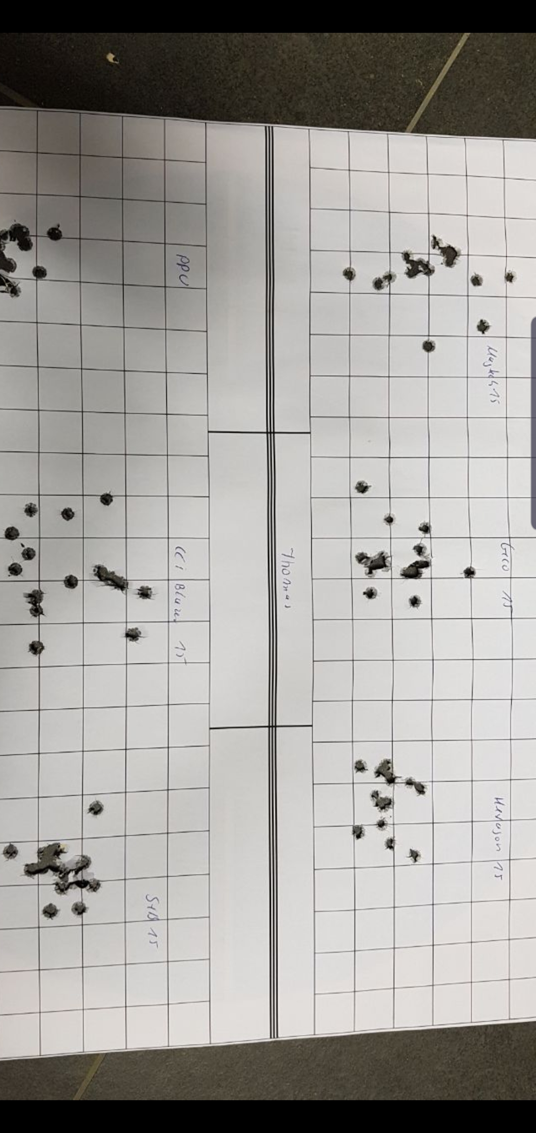 • Ein Los der Geco Semi Auto hat das mal geschafft. Die Geco Semi Auto hatte eigentlich immer einen schlechten Streukreis, war schon extrem auffällig. Getestet wurden 2x AW 93 und 1x SSP.