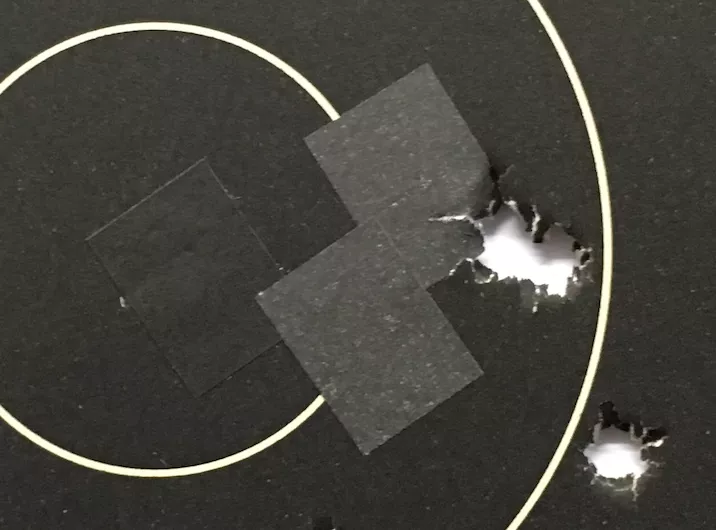 • Eine Frage zum Abkleben von Papierscheiben beim Beschuss durch GK: Wir verwenden Schusspflaster in verschiedenen Größen. Auf der abgebildeten Scheibe sind schwarze Klebestreifen zu sehen, die mir recht praktisch erscheinen.