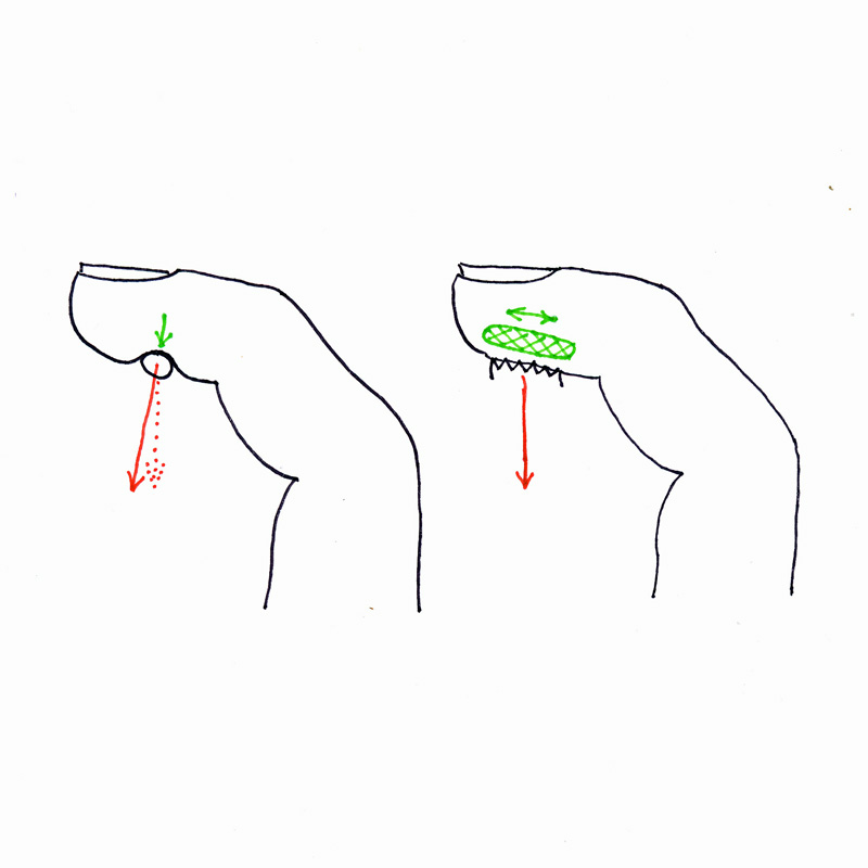 - Der Zeigefinger ist am letzten Glied nun rechtwinklig.- Die deutliche Kante des Züngels sitzt genau am Übergang vom ersten zum zweiten Fingerglied. Was ein erstaunlich wiederholgenaues Einsetzen des Finger ermöglicht (zumindesteng gefühlt)