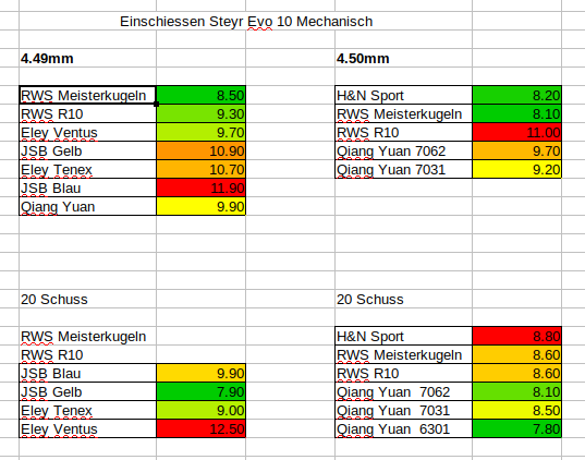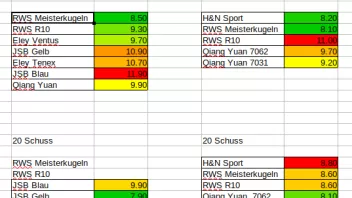 Die von der diesjährigen DM München mitgebrachten seriennummerlosen RWS Basic Diabolos, Preis < 3 €, haben wir zuhause aus einer Schießmaschine getestet, Einspannung am Griff.
