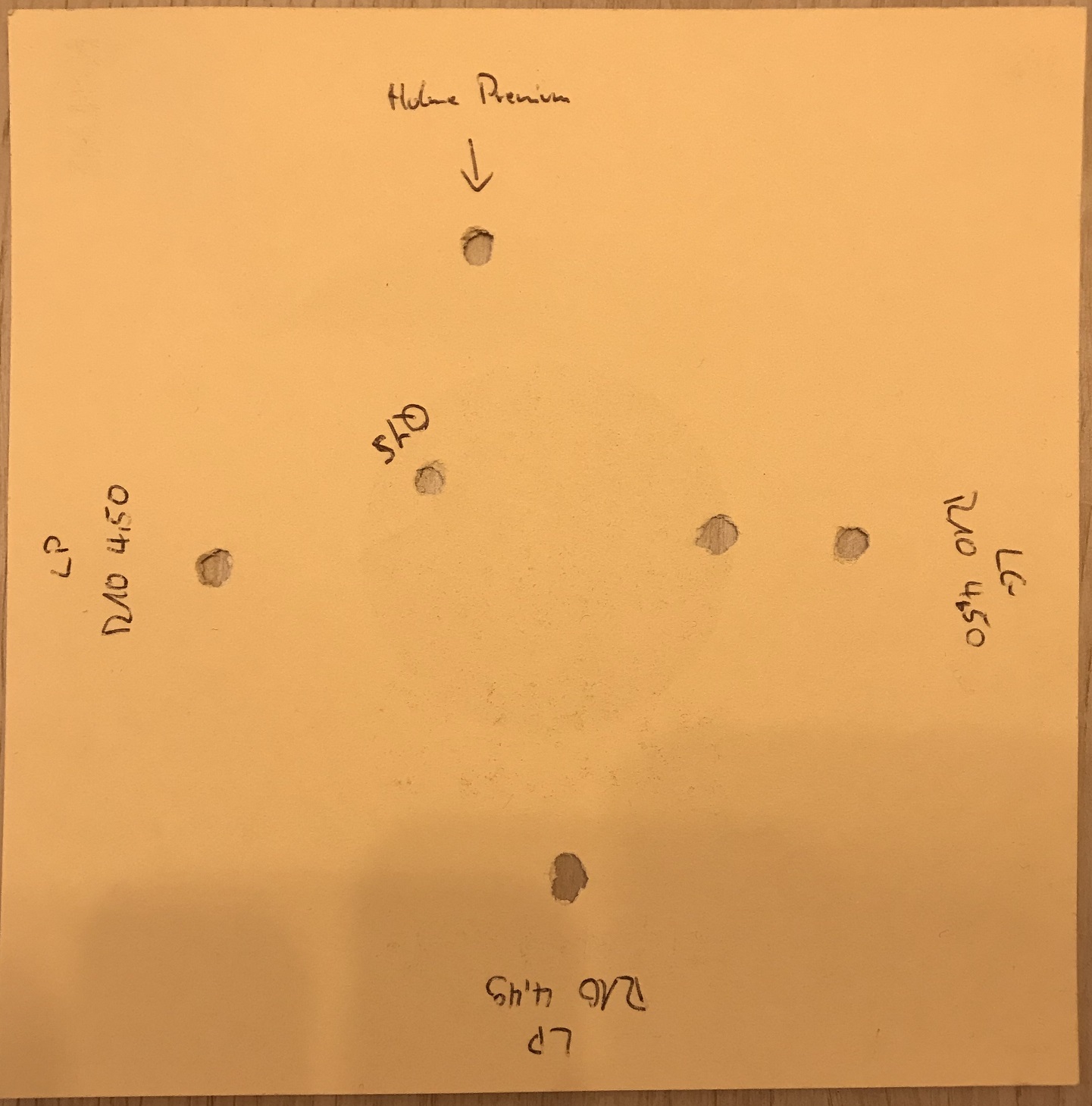 Eine FWB P44 und meine Pardini K2. Aus beiden LPs: Streukreis außen umschlossen < 10 mm. D.h. alle Treffer haben eine Mouche geschossen.