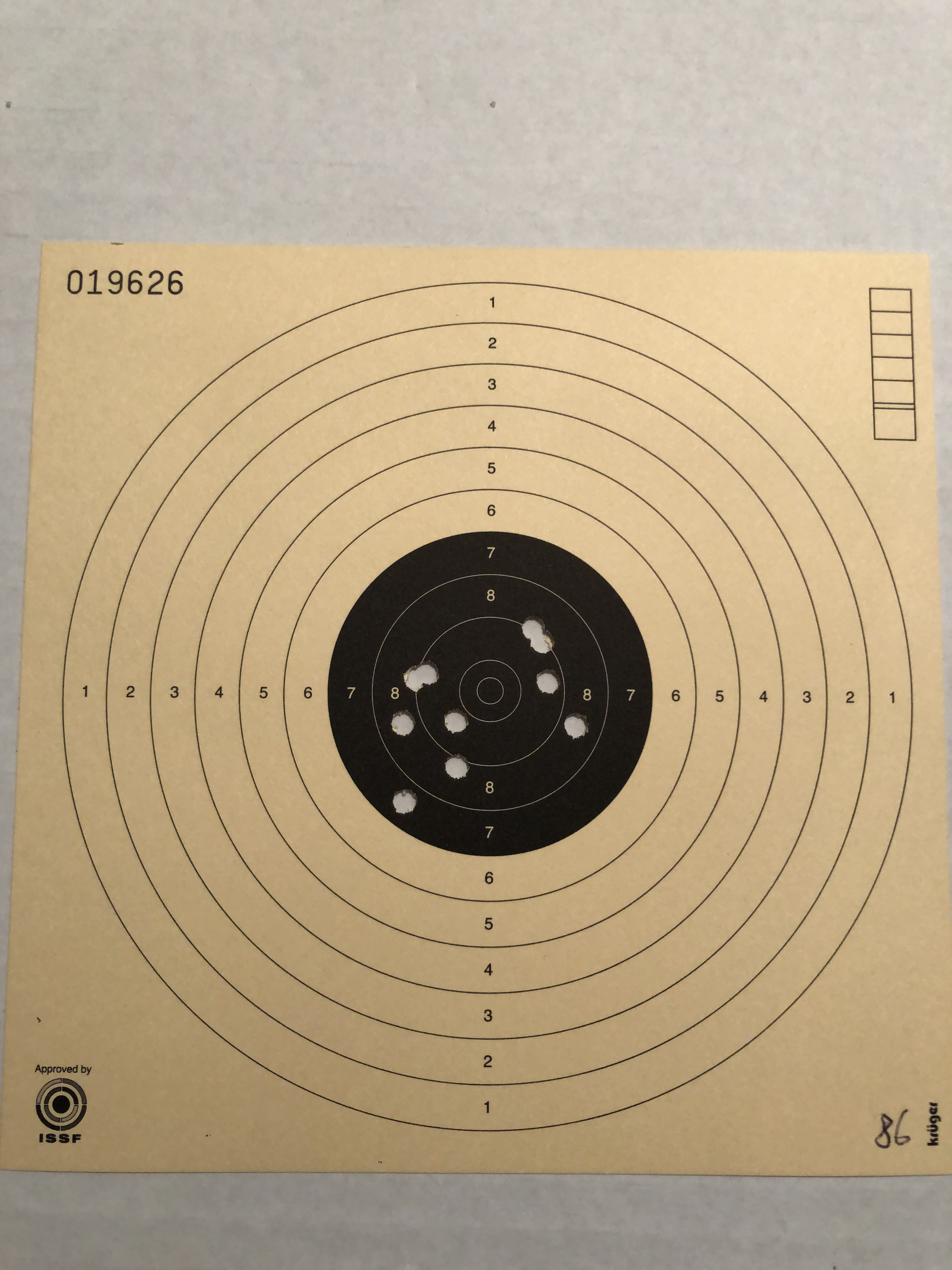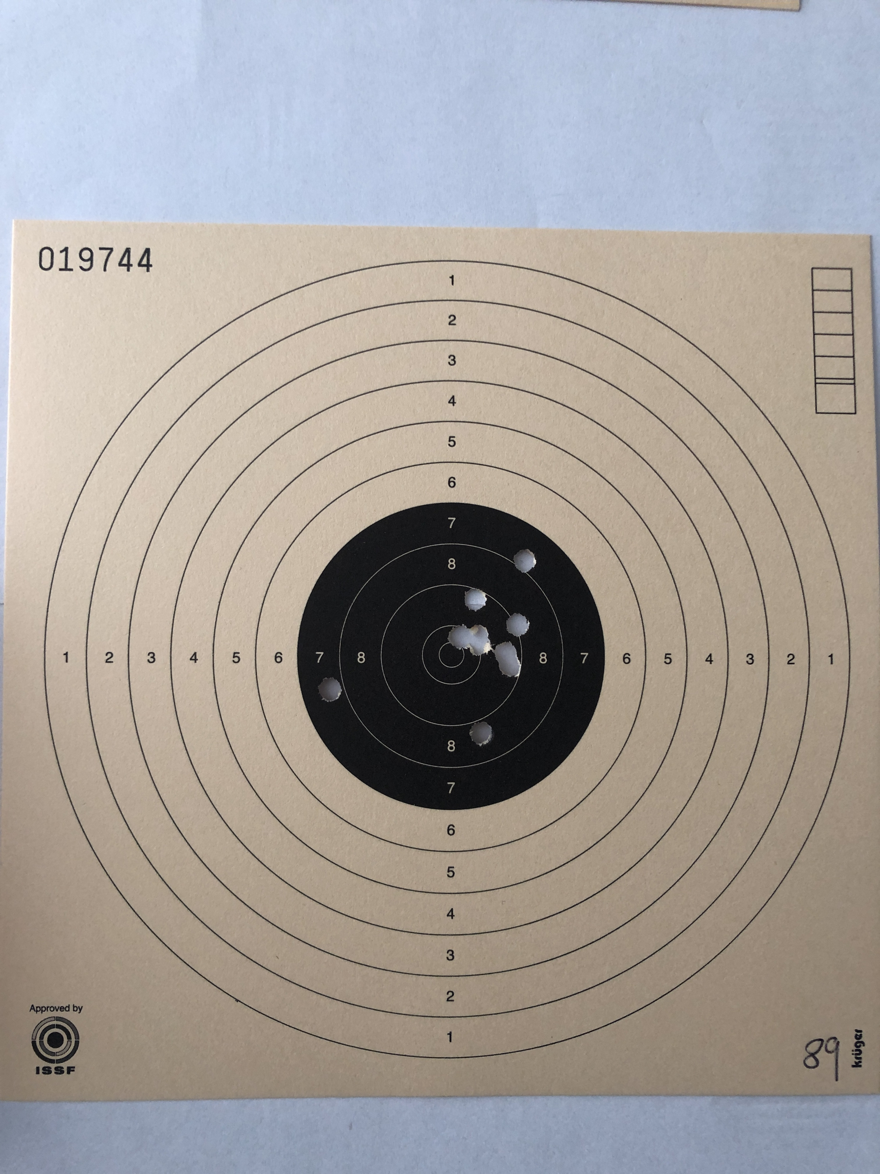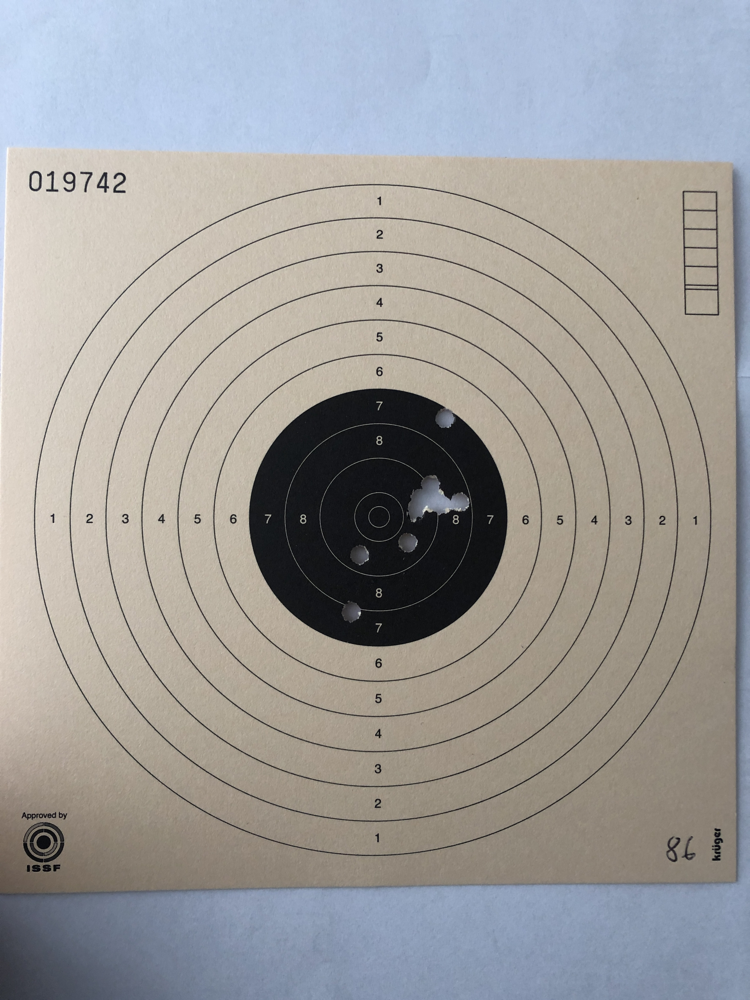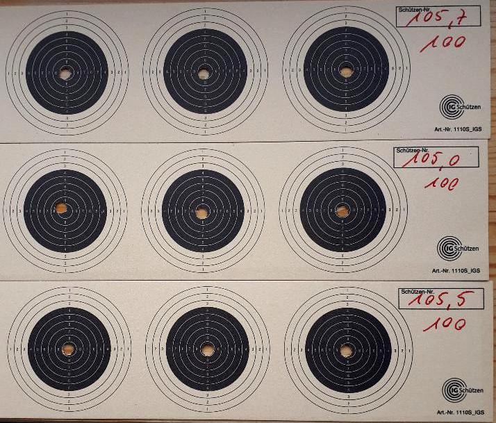 für mich ein Spitzenergebnis! Und wie man aus den jeweils letzten 3 Schuss sehen kann, hätte eine Korrektur in der Höhe um jeweils 2 „Knacken“ das Ergebnis noch verbessern können.