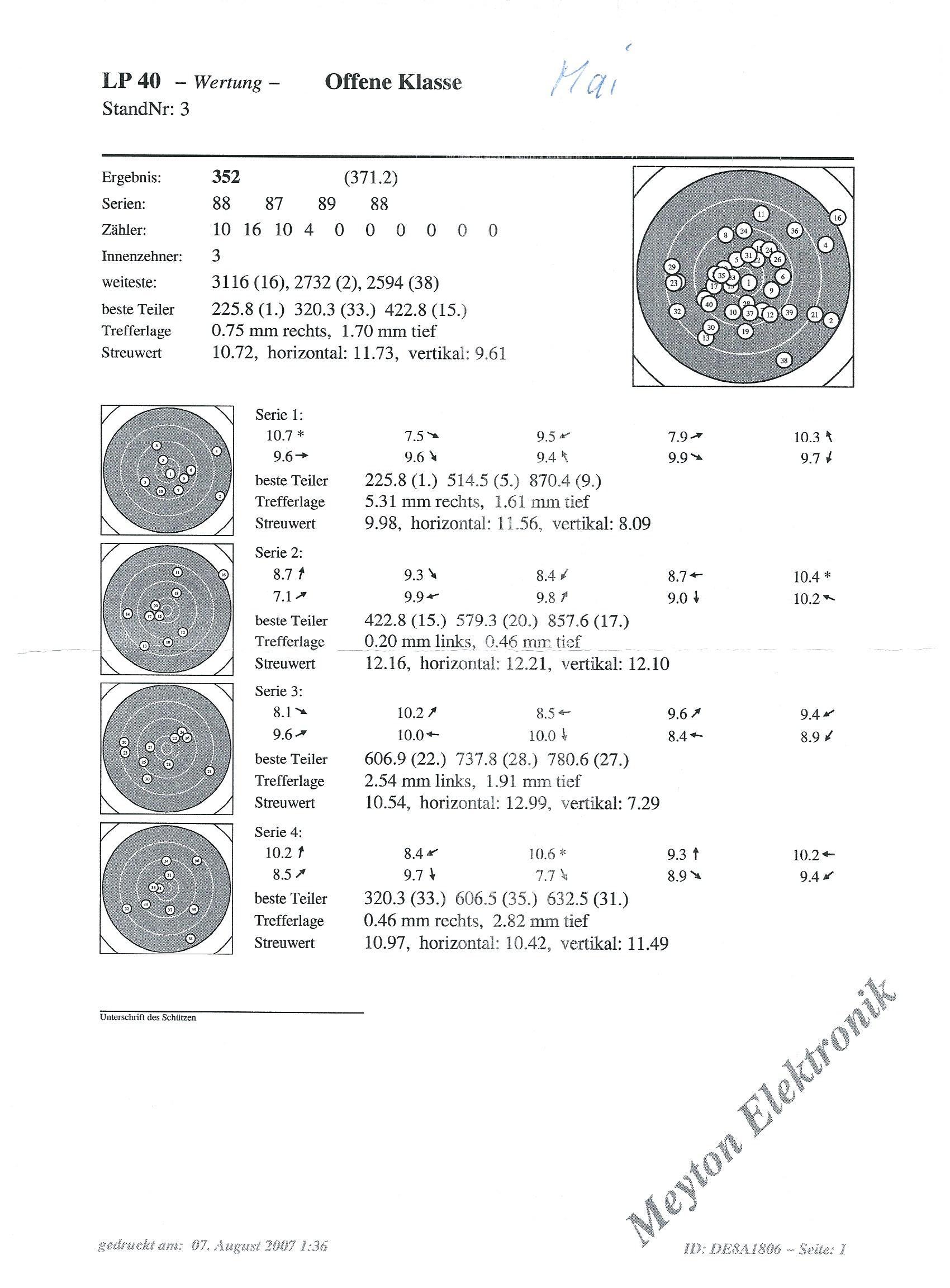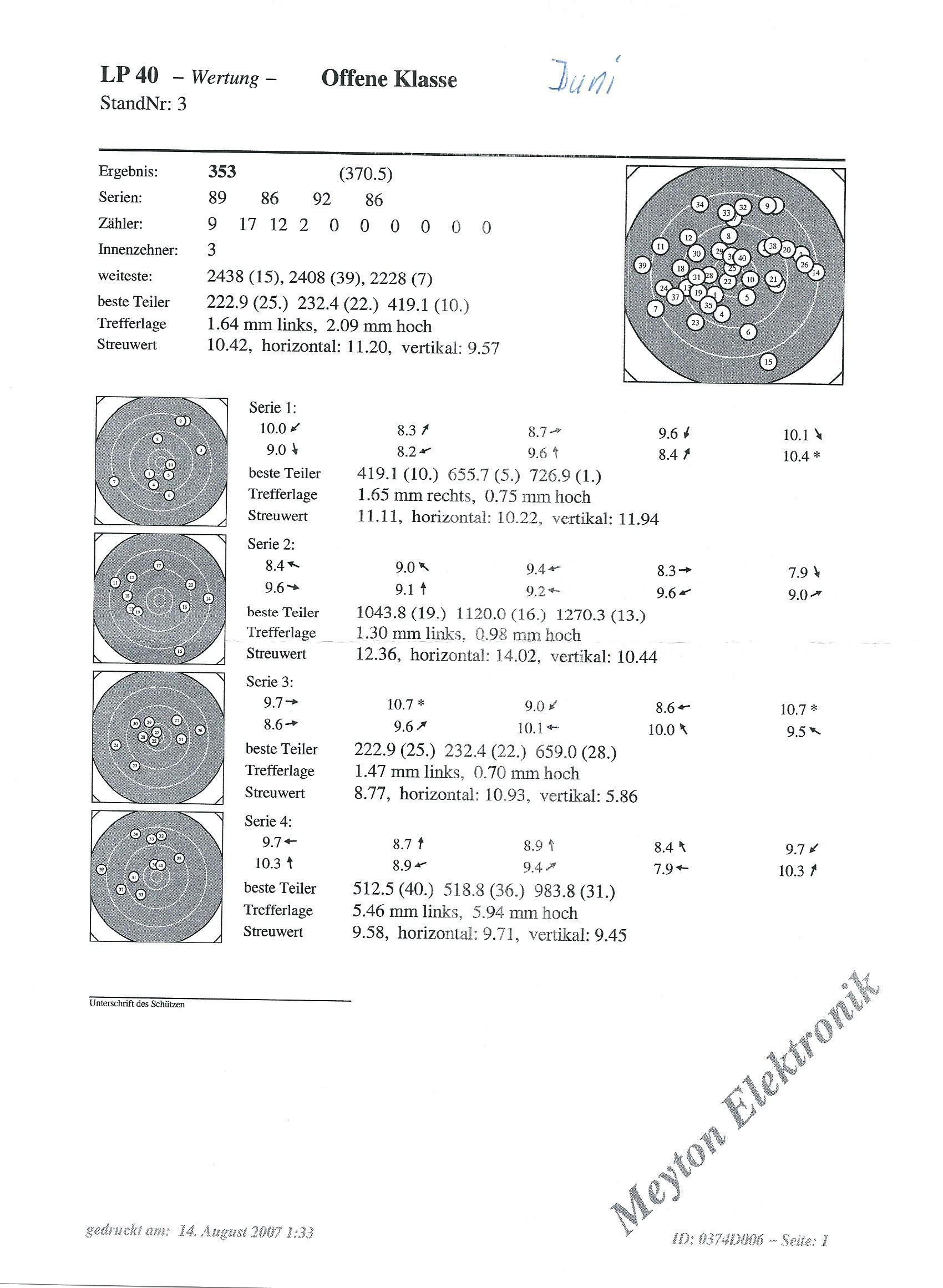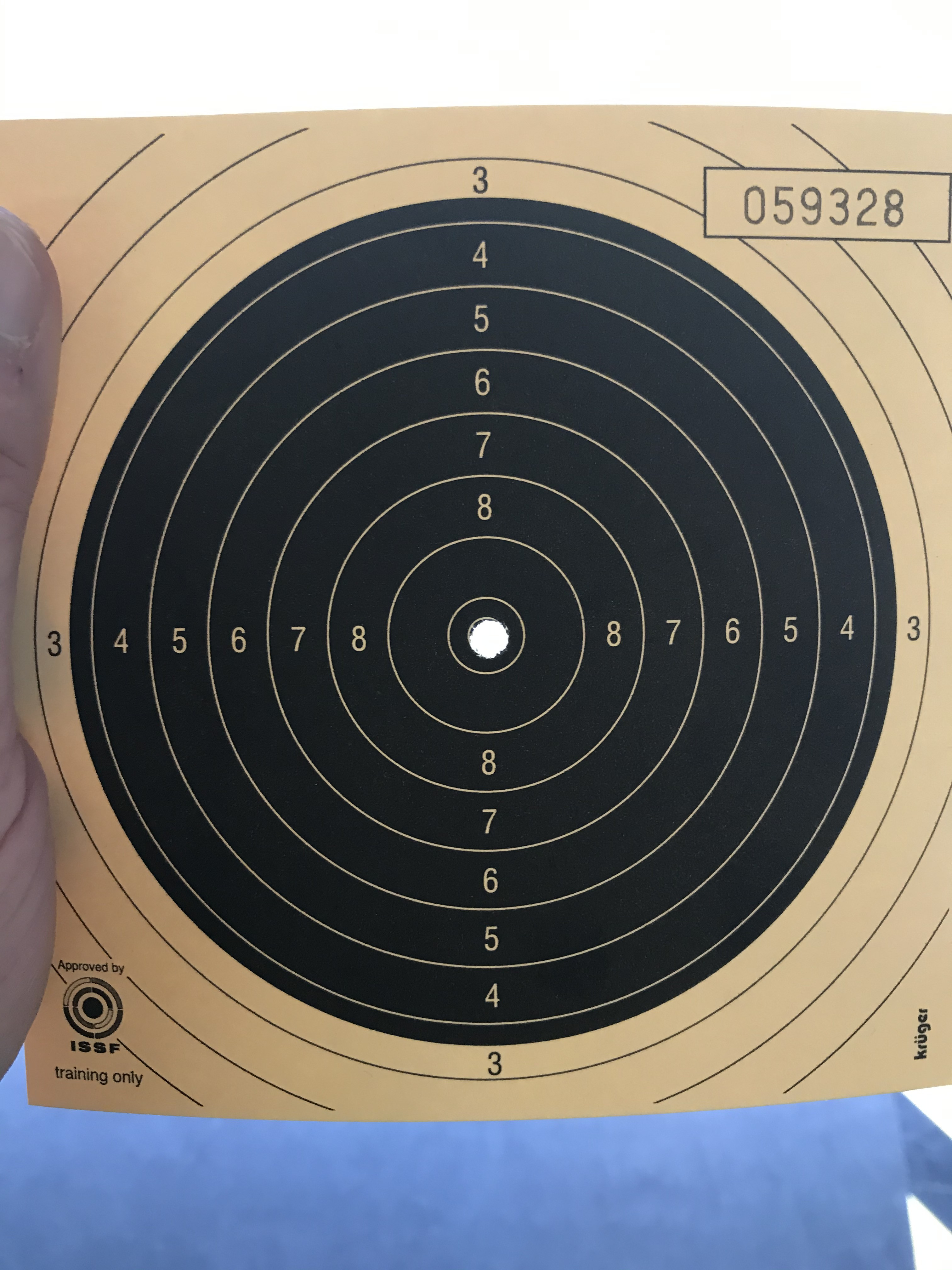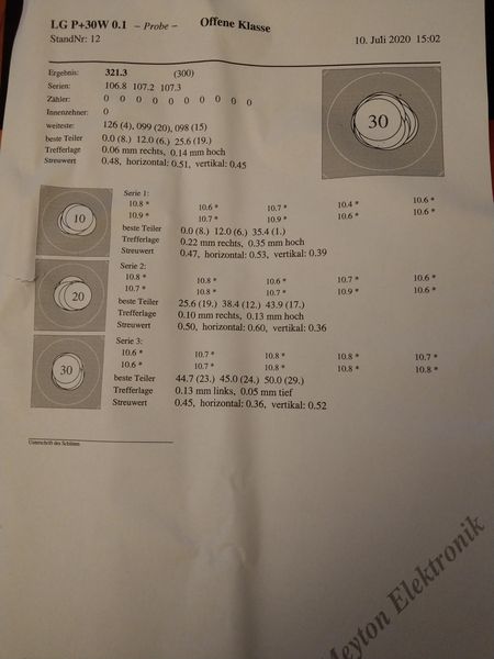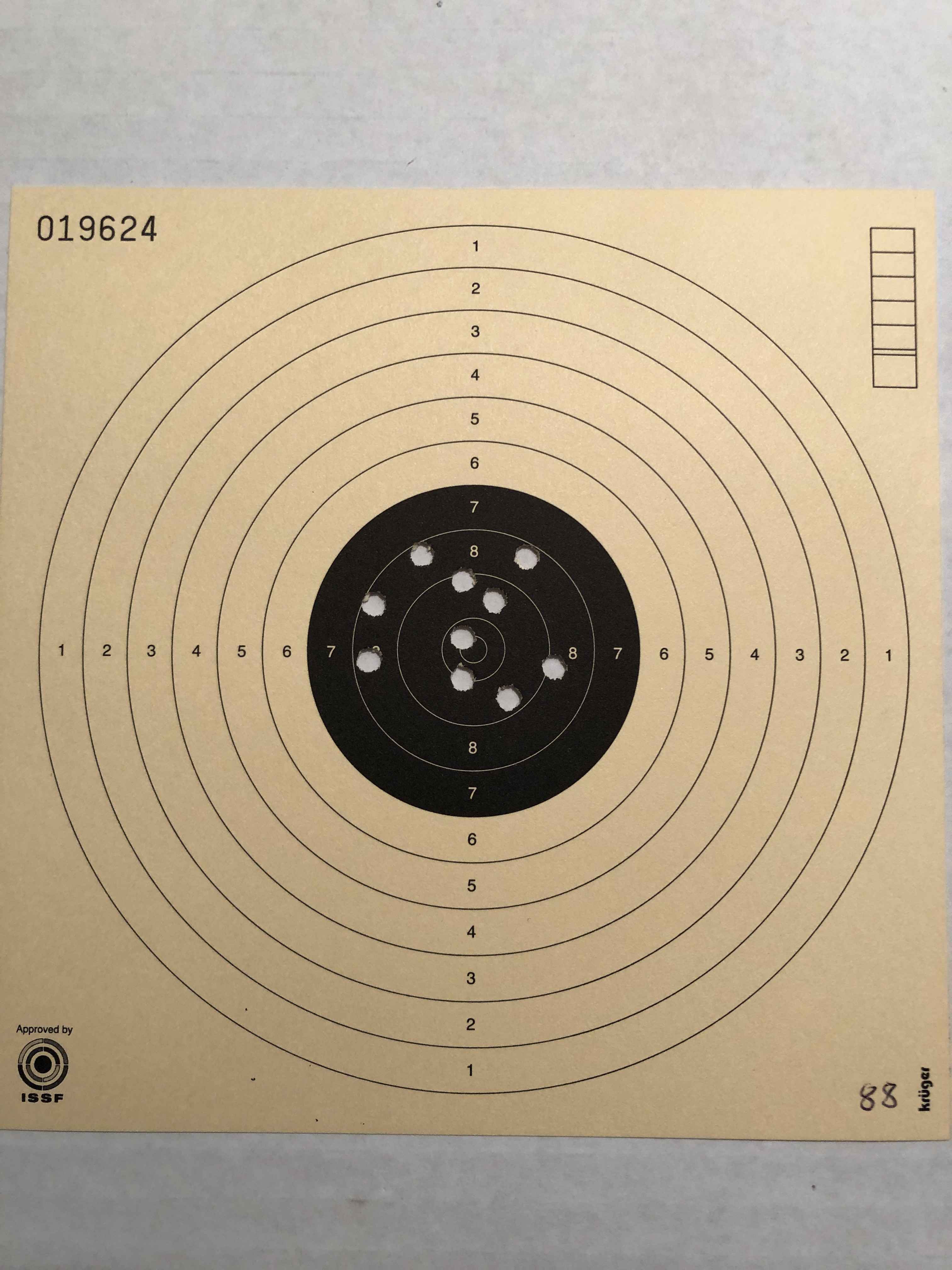 für mich ein Spitzenergebnis! Und wie man aus den jeweils letzten 3 Schuss sehen kann, hätte eine Korrektur in der Höhe um jeweils 2 „Knacken“ das Ergebnis noch verbessern können.