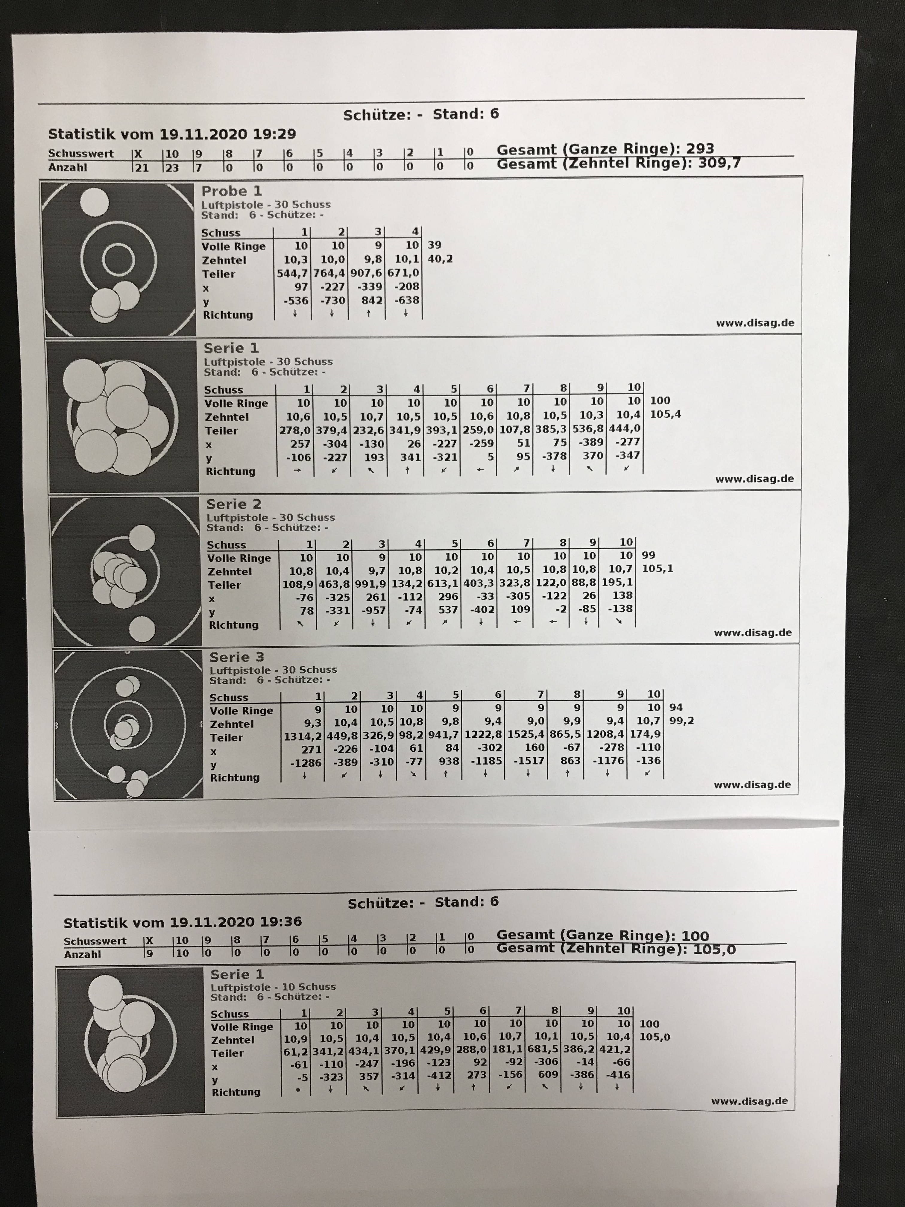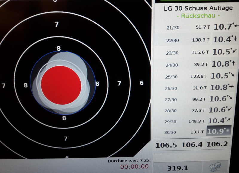 in der dritten Serie 105,1 waren eine 10,3 und eine 10,0 zu viel. Da passte der Finger am Abzug noch nicht und es war zu viel Spannung in Arm und Schulter. Ab 107 Ringe ist ein Fehler nicht mehr auszugleichen. Es war insgesamt die 2. Durchgang. Im 1. Waren es 318,5 Ringe und im 3. Durchgang 318,4 Ringe.