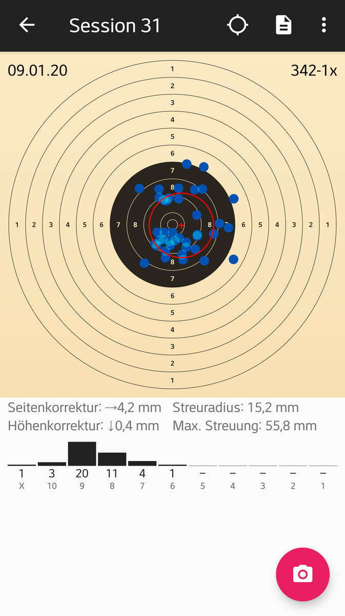 War ein "Trainingswettkampf", mit dem Schussbild war ich durchaus zufrieden: wenige 8er (in jeder Serie 2:D und keine 7:love:), nur die 10er wollten nicht recht fallen, in Serie 1 und 4 gar keiner, in 3 nur einer, nur die zweite Serie war irgendwie total anders, da fiel eine 10 nach der anderen.