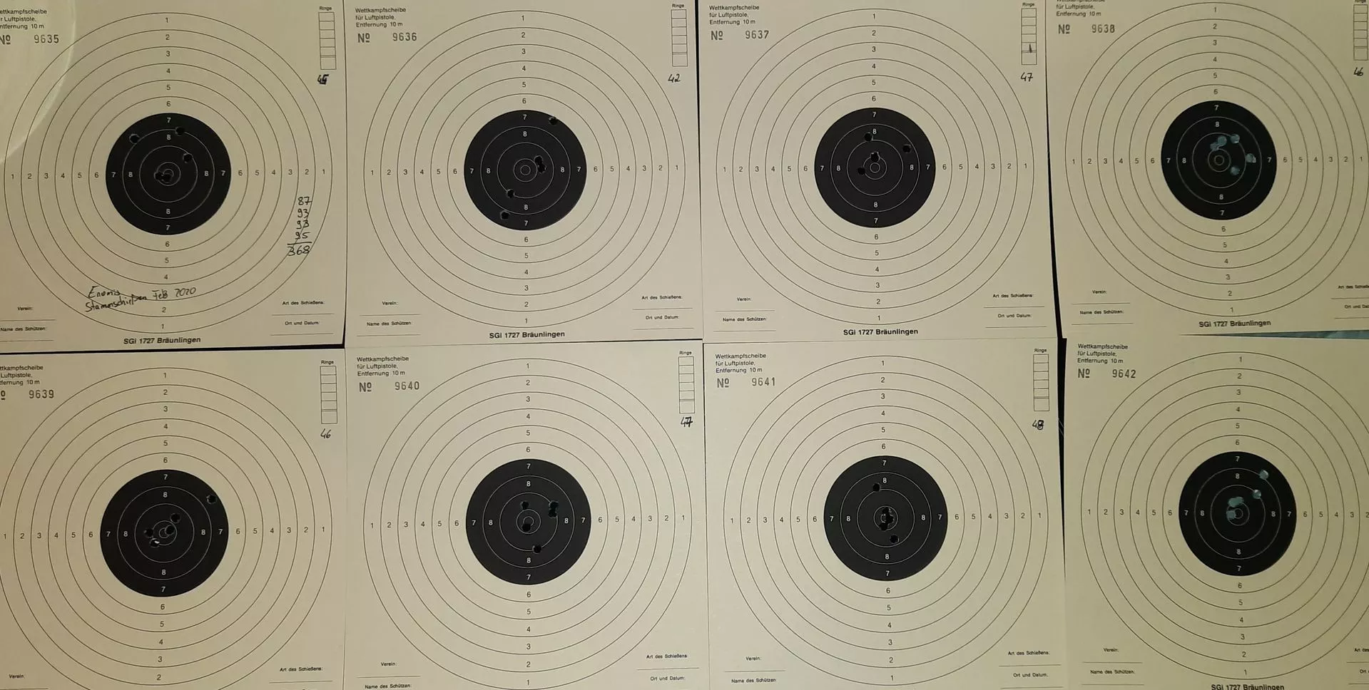 Weiter ging es: Serie 2 (90 Ringe) und Serie 3 (91 Ringe) immer noch die 6 im Kopf, öfter abgesetzt aber konnte nie sauber abziehen und wurde mit vielen 9er aber auf 2x 8 und wenig 10er belohnt... in der letzten Serie hab ich mich noch mal zusammen gerissen und mit 96 ausgeschossen, hier lief es wieder 8)