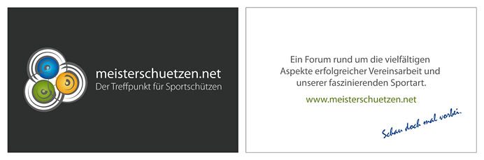 Ich finde das Wort Meisterschütze ein bisschen arogant, ich würde unter das logo Startseite - meisterschuetzen.net machen . Hat dann auch einen viel besseren Werbeeffekt, weil so denkt man das hat sich einfach ein kleiner arroganter schütze drucken lassen.