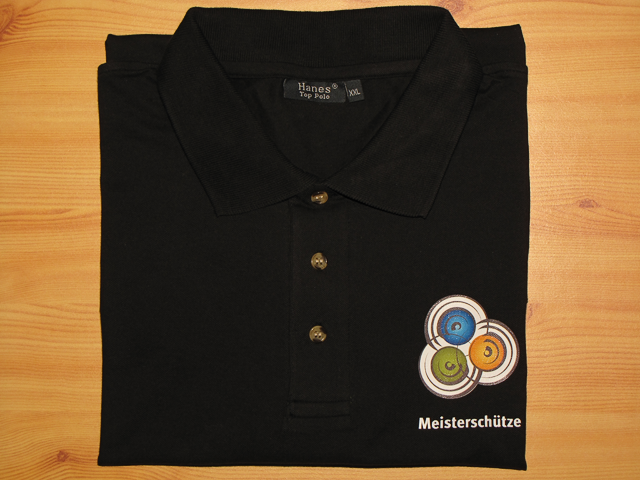 Ich habe vor einigen Tagen bei einem anderen Anbieter ein weiteres Muster bestellt. Bei ihm könntet ihr auch direkt bestellen. Was haltet ihr eigentlich vom gewählten Aufdruck? Auf der linken Brustseite befindet sich unser Logo und darunter der Text „Meisterschütze“.