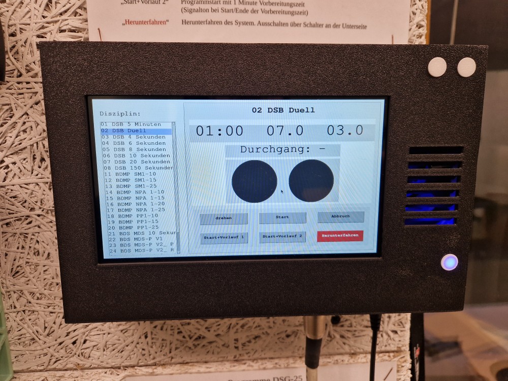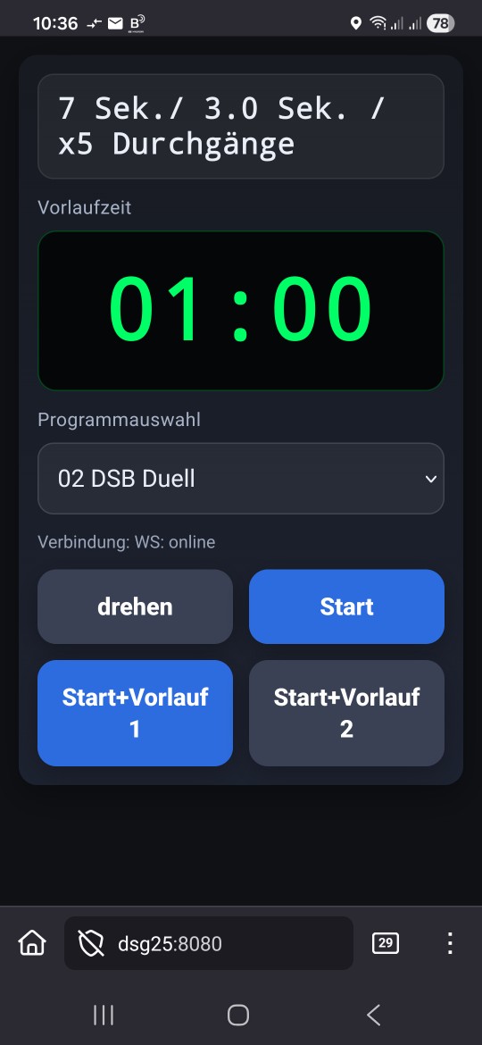 Auch eine Remote Funktion habe ich inzwischen implementiert. Über ein Handy/Tablet (nur Android getestet) können fast alle Funktionen der Touchoberfläche über einen Webbrowser bedient werden, wie: Disziplin Auswahl, Starten der Programme wie mit dem Funktaster. Es wird auch der Ablauf der 1 Minute angezeigt.