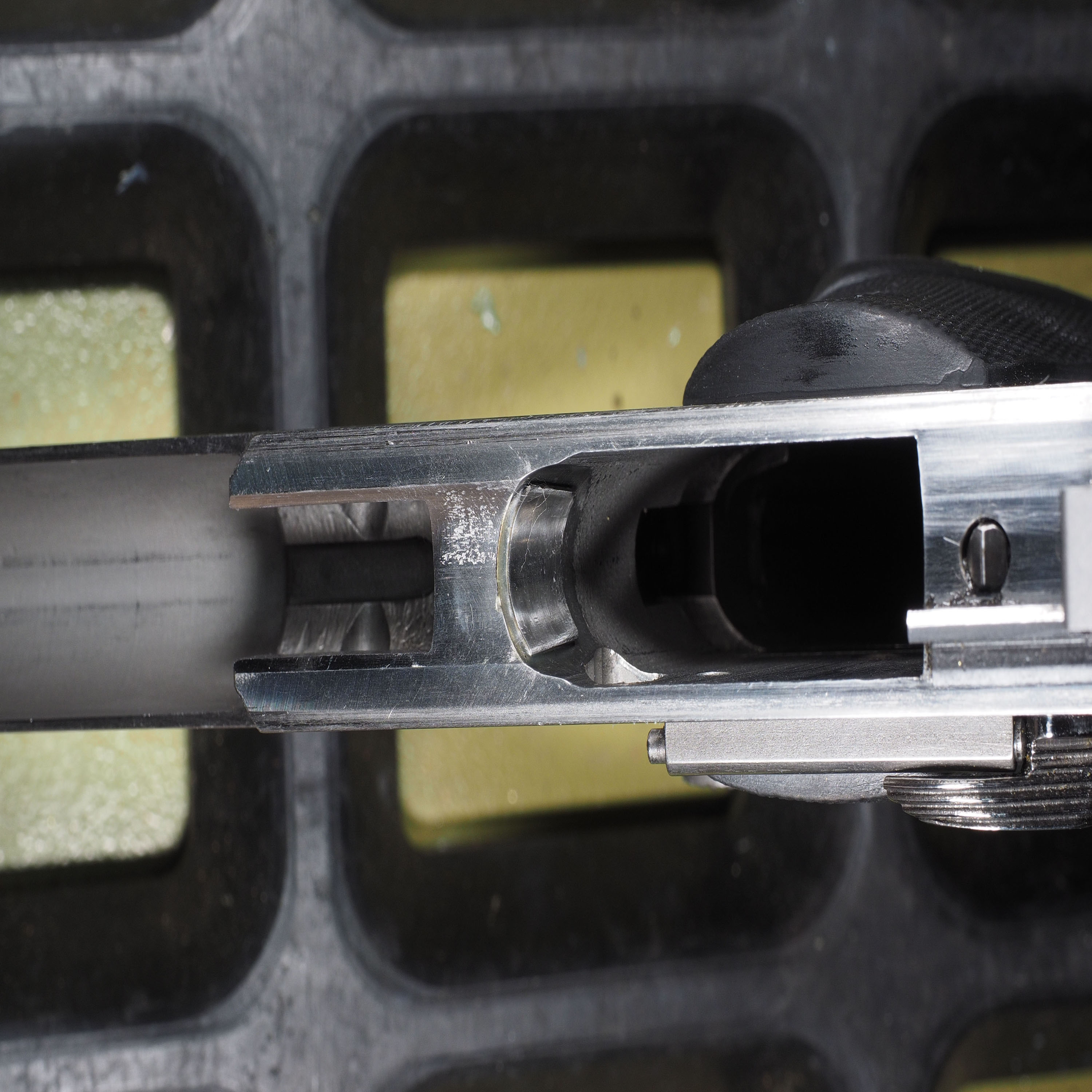 Nun habe ich ein kleines Edelstahlblech, 0,75mm, unterhalb der Rampe ins Griffstück geklebt. Und siehe da, diese Maßnahme ist sehr erfolgreich. Die Patronen flutschen wie