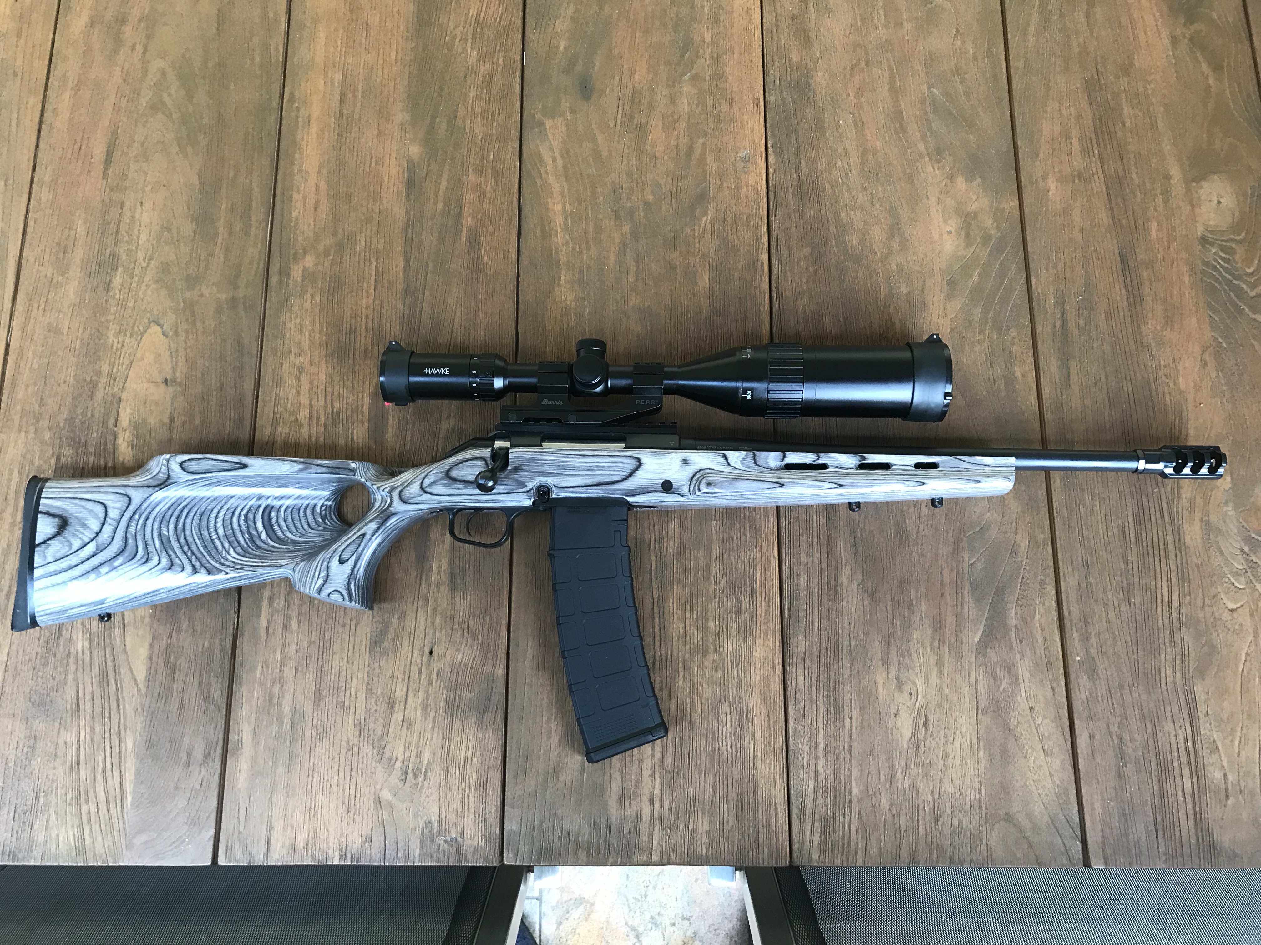 Die Waffe ist eine Ruger American Ranch im Kal. .223Rem mit AR15-Magazinführung. Bisher habe ich die Waffe nur einmal geschossen nach der Montage. Mit der billigen S&B Vollmantel 55gr. hält sie auf 50m einen Durchmesser von ca. 17-18mm. Der Schaft ist nachträglich von Boyds-Stocks. Also alle Teile aus USA, nur das ZF von Hawke kommt nach meiner Kenntnis aus England. Der Abzug ist auch nachträglich ausgetauscht gegen einen Matchabzug von Timney.