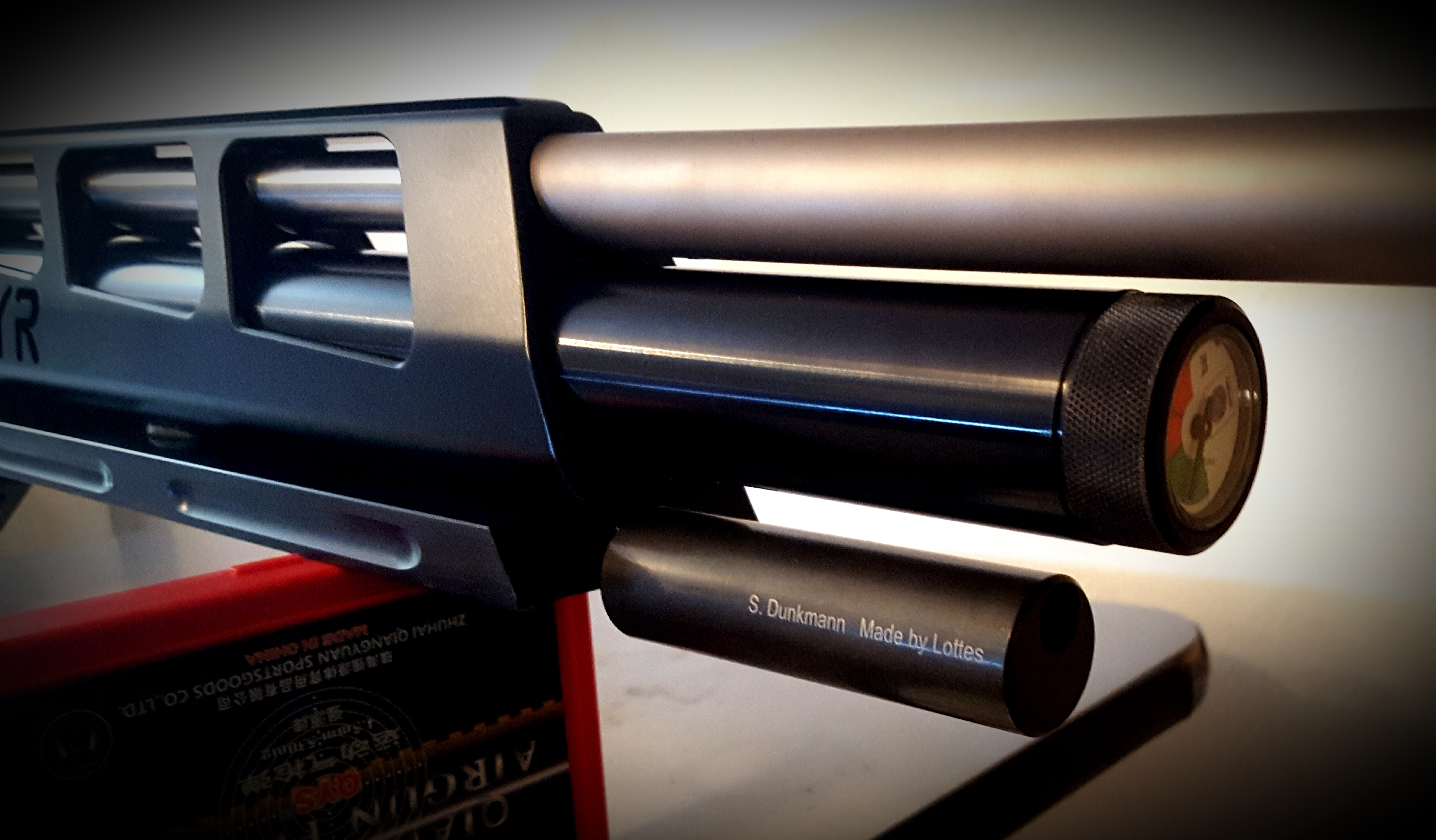 Auch an der Steyr Challenge habe ich das Gewicht von Lottes mit Hilfe einer AHG Stange an der Contact Plus Schiene montiert. Waffe liegt satt auf der Auflagerolle auf.
