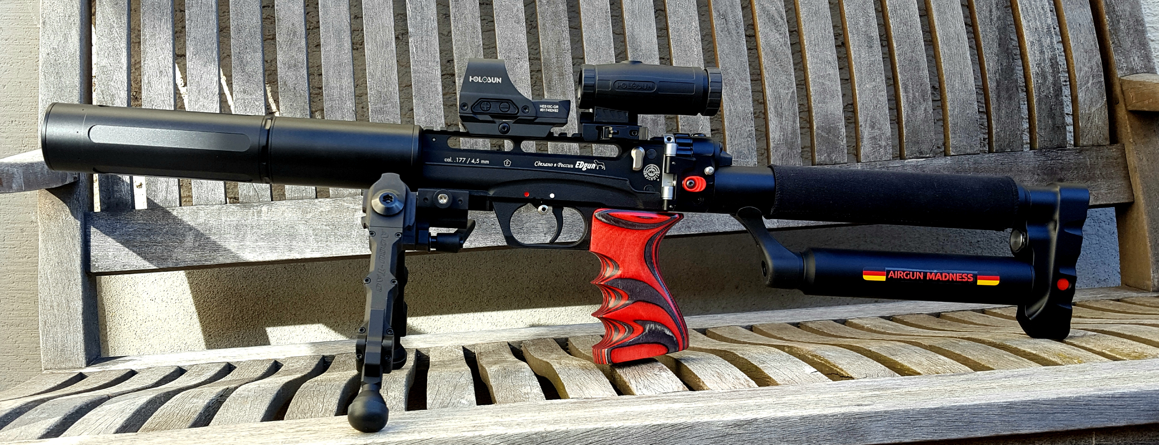 Donny FL Ronin und Shroud, Holosun 510 C mit wegklappbaren 3x Magnifier, Zweibein von Accu-Tac, Massgriff von Steven Brown. Im Koffer dabei ein Hawke ZF mit Ringabsehen und Leichtbau-Blockmontage von Era-Tec, 4 x Magazine in Spezial-Behältern.