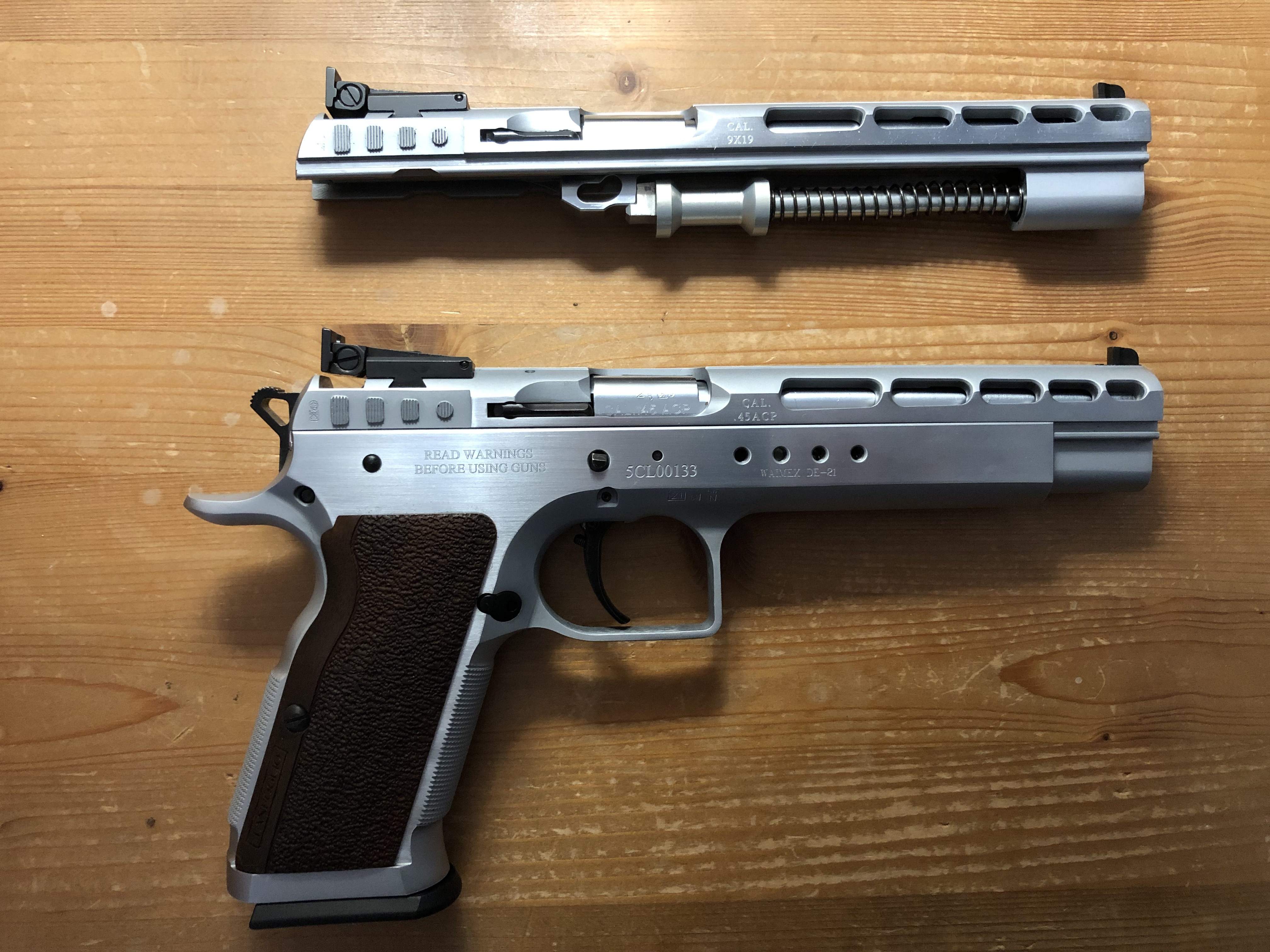 Durch den 6'' Schlitten liegt sie auch sehr ruhig bei der Schussabgabe. Egal ob mit 9mm oder 45er.