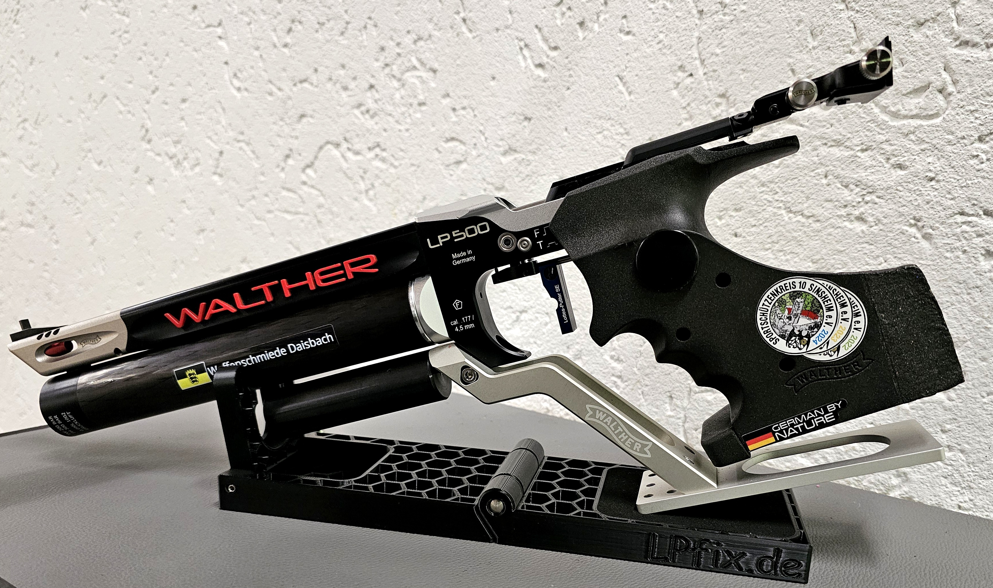 Das ganze Tuning geht in die richtige Richtung. Lange Visierlinie um Visierfehler zu minimieren, denn ein perfekt gestrichenes Korn ist durch die Wipperei bei Auflage nicht so einfach zu halten. Ordentlich Gewicht und eine nach vorne verschobene Auflageplatte ermöglicht einen vorverlegten Auflagepunkt. Verlängerter Griff zur besseren Fixierung und Führigkeit.
